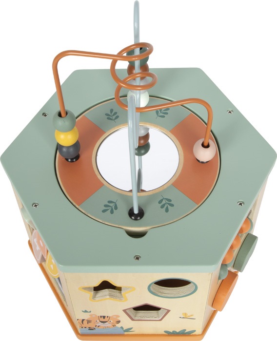 Tato motorická kostka z robustního dřeva s motivem safari nabízí spoustu činností a zábavy na sedmi různorodých plochách.