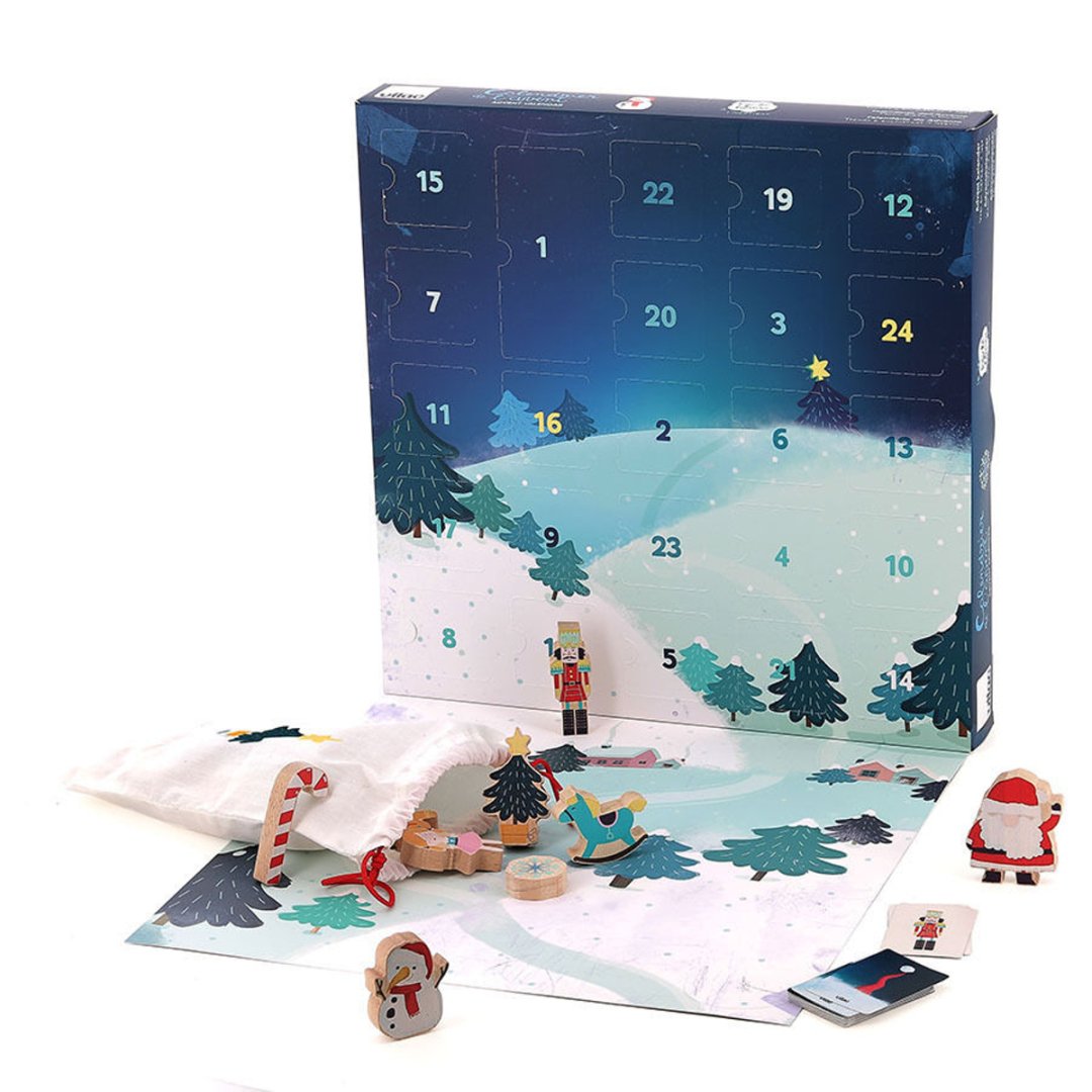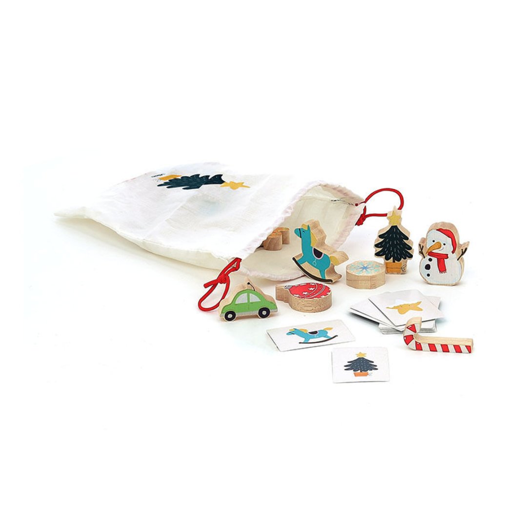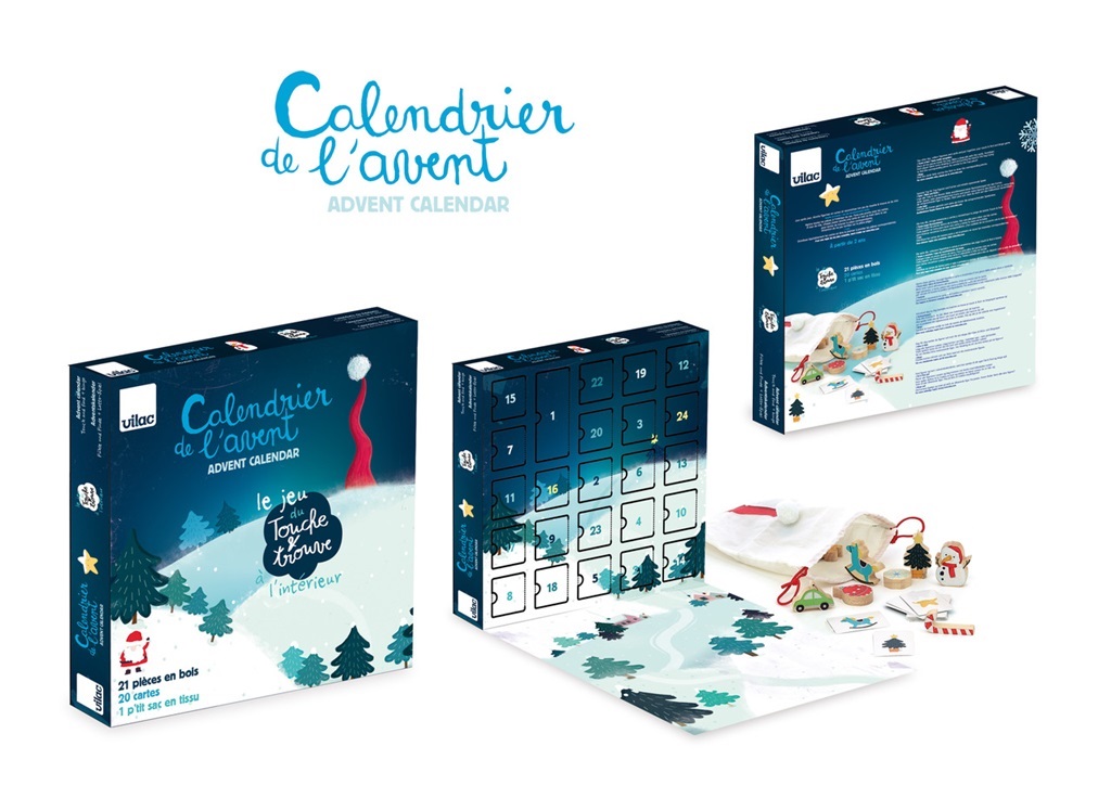 Adventní kalendář, který uvnitř skrývá hru hmatej a najdi!Adventní kalendář, který uvnitř skrývá hru hmatej a najdi! V každém z 24 okének děti najdou dřevěný dílek nebo papírovou kartičku, nechybí ani textilní pytlík. Po otevření celého kalendáře si děti konečně mohou užít hru hmatej a najdi ve vánočním designu. Hmatej a najdi je nepřekonaný bestseller Vilac. Originálním způsobem se snaží rozvíjet často opomíjený smysl dětí, hmat. Hra je tvořená zejména dřevěnými figurkami ukrytými v látkovém pytlíku. Menší děti mají za úkol po vložení ruky do pytlíku jen na základě hmatání popsat svými slovy, jaký předmět drží v ruce. Rodiče mohou postup dětem předvést názorným příkladem. Starší děti mohou hrát hru ve formě lota, nebo binga, k těmto hrám jsou v sadě k dispozici obrázkové karty jednotlivých předmětů. V balení 21 dřevěných dílků, 20 papírových karet, textilní pytlík.