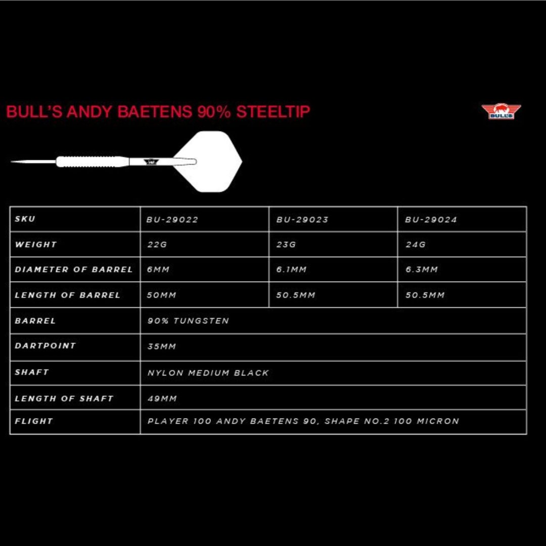 Steelové šipky Andy Baetens jsou wolframové šipky (90% tungsten) s hladkými barrely bez drážkování. Barrely jsou doplněny nylonovými násadkami a letkami Andy Baetens.