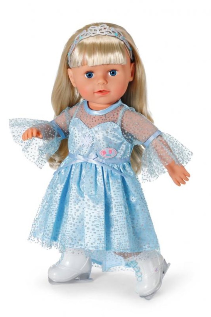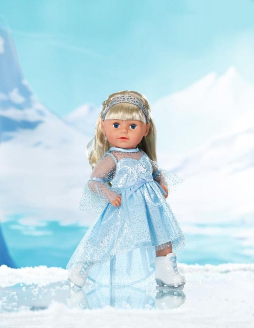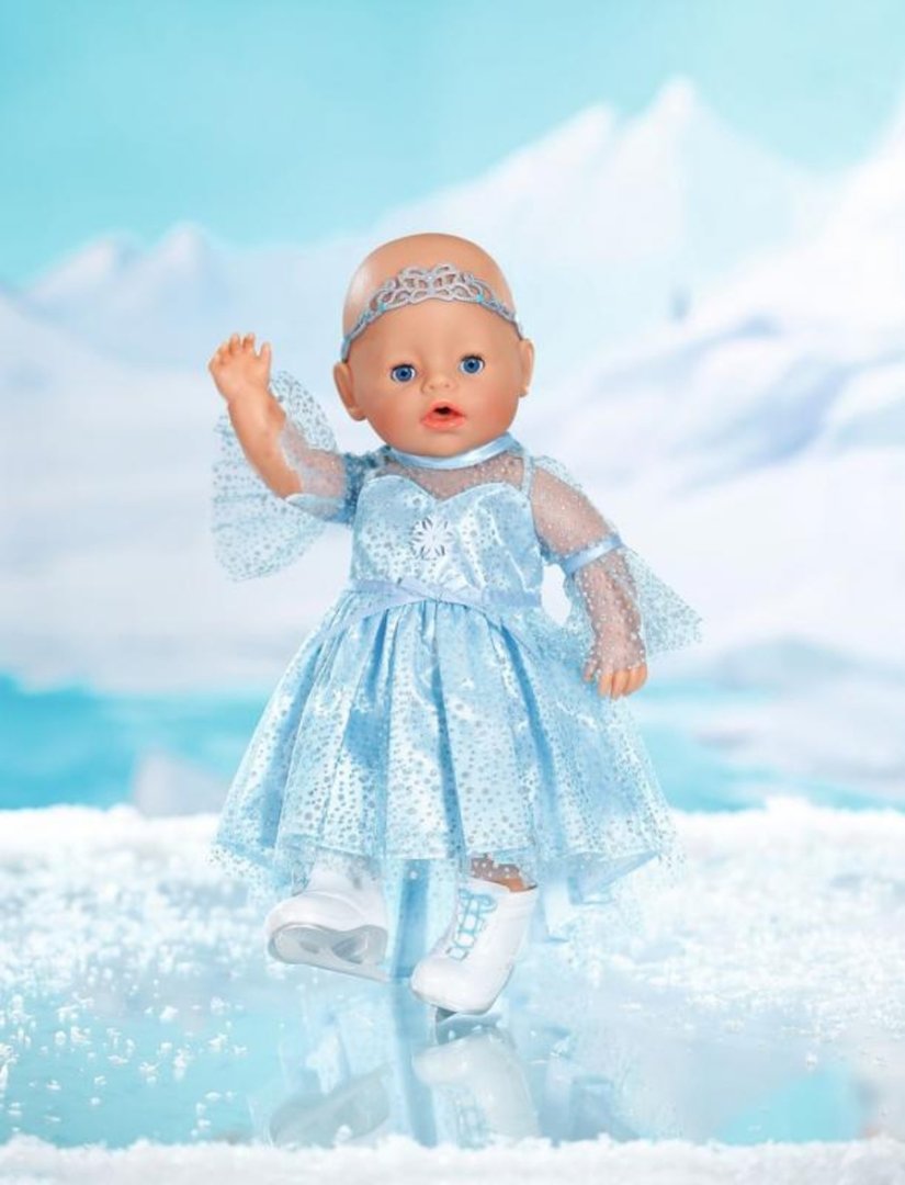 Baby Born ve třpytivých šatech pro ledové princezny nejde přehlédnout. V krásných bruslích snadno klouže po zamrzlém jezeře s Teddym a Carlou. K šatům patří i diadém, který skvěle drží na hlavě během všech piruet.