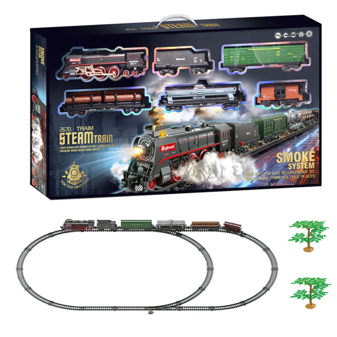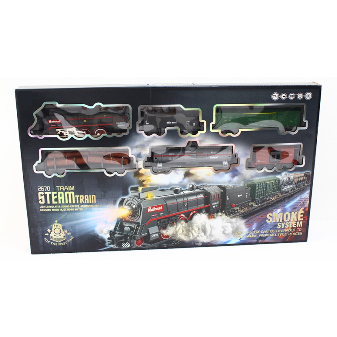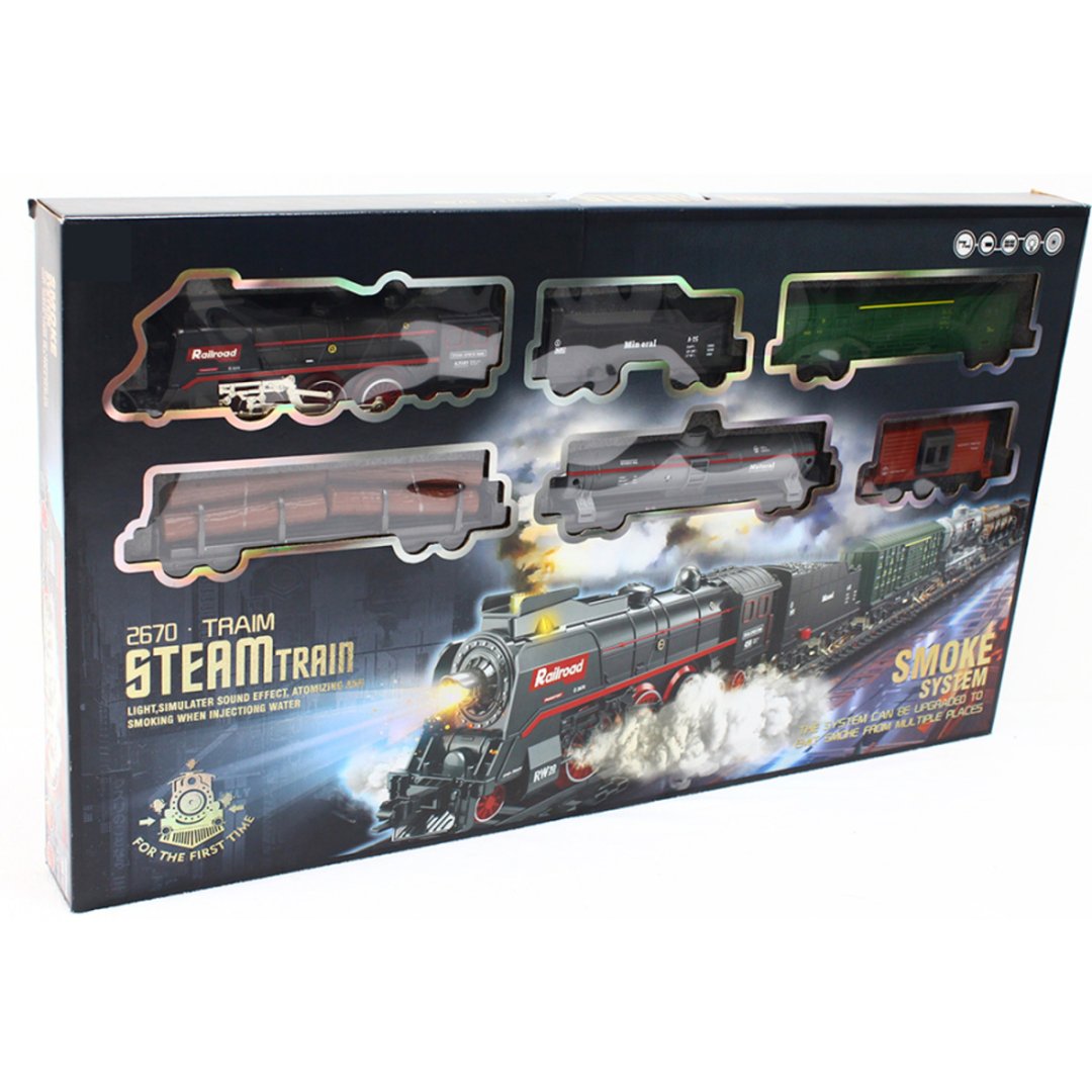 Elektrická vláčkodráha s parní lokomotivou, s kouřem, světlem a zvukem.Elektrická vláčkodráha s parní lokomotivou, s kouřem, světlem a zvukem.