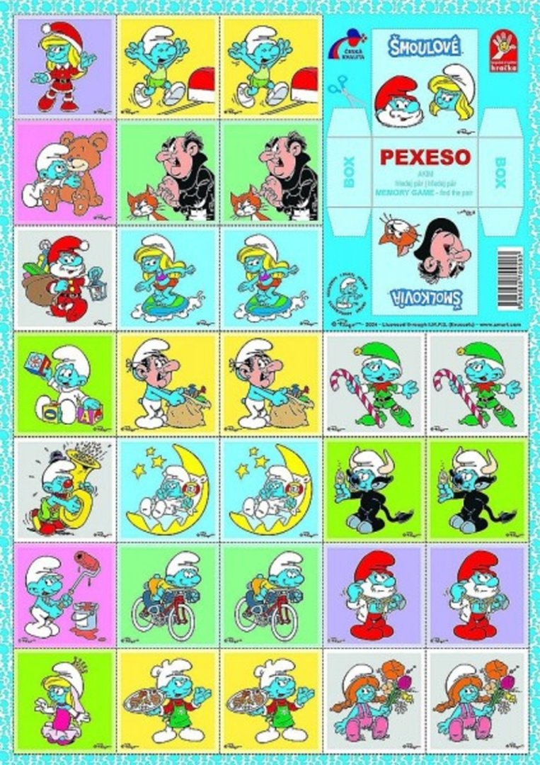 Papírové pexeso s motivem oblíbených šmoulů. Na pexesech u titulního obrázku umístěn box k vystřižení pro možnost vložení vystřižených kartiček