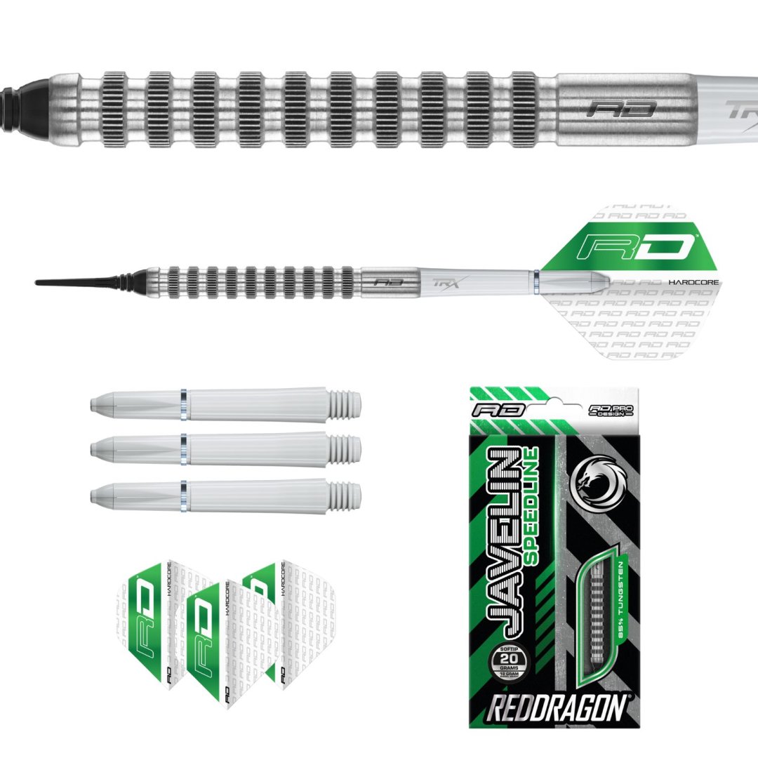 Softové šipky Red Dragon Javelin Speedline jsou wolframové šipky (85% tungsten) s dlouhými rovnými barrely, které mají po celé délce linerání prstencové drážkování. Doplněny jsou nylonovými násadkami TRX a letkami Red Dragon Hardcore.
