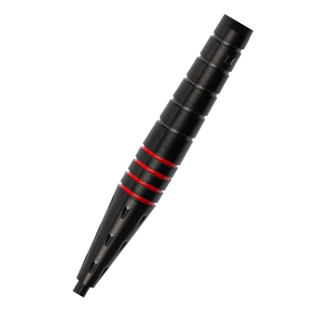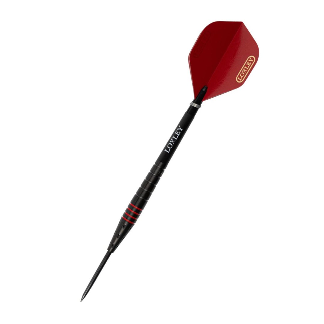 Steelové šipky Loxley Psycho jsou wolframové šipky (90% tungsten) s černými barrely, které zdobí červené proužky.