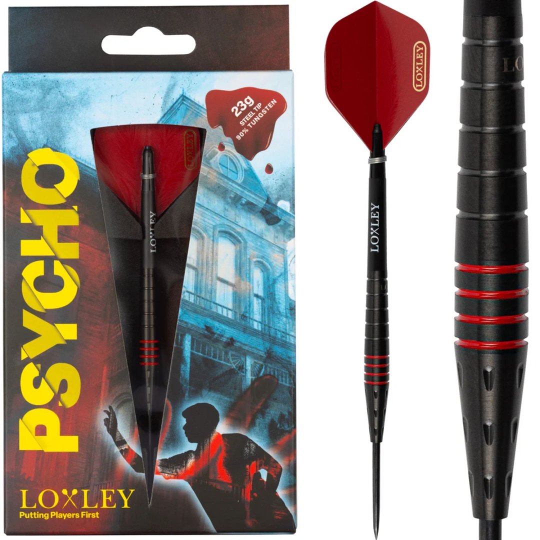 Steelové šipky Loxley Psycho jsou wolframové šipky (90% tungsten) s černými barrely, které zdobí červené proužky. Barrely jsou doplněny nylonovými násadkami a letkami Loxley.