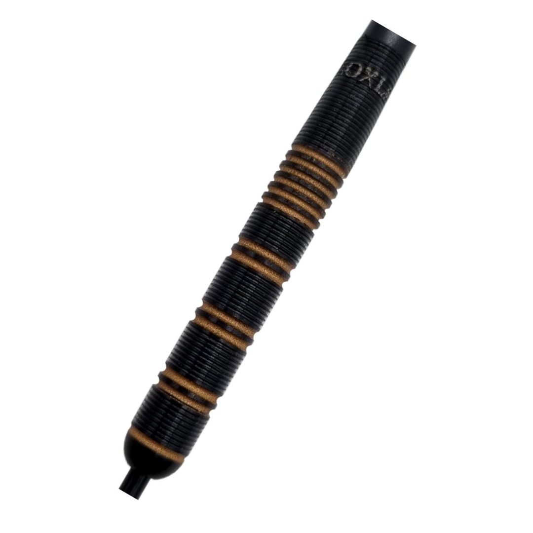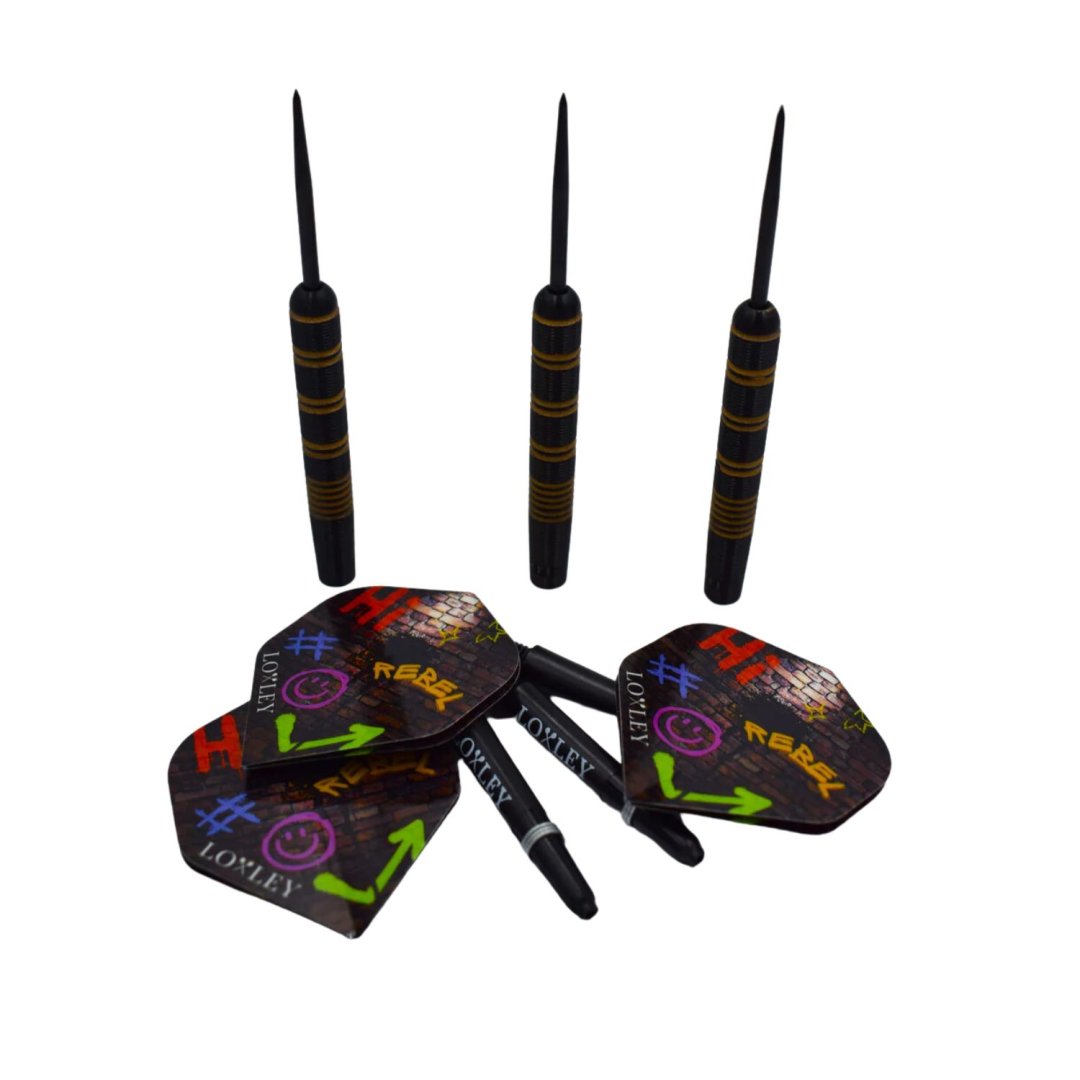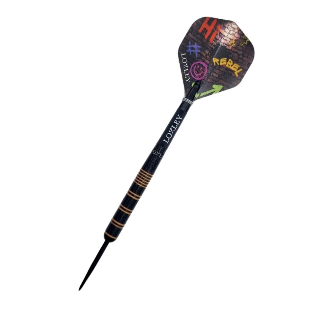 Steelové šipky Loxley Ronny Rebel jsou wolframové šipky (90% tungsten) s černými barrely, které zdobí bronzové proužky. Barrely jsou doplněny nylonovými násadkami a letkami Loxley.