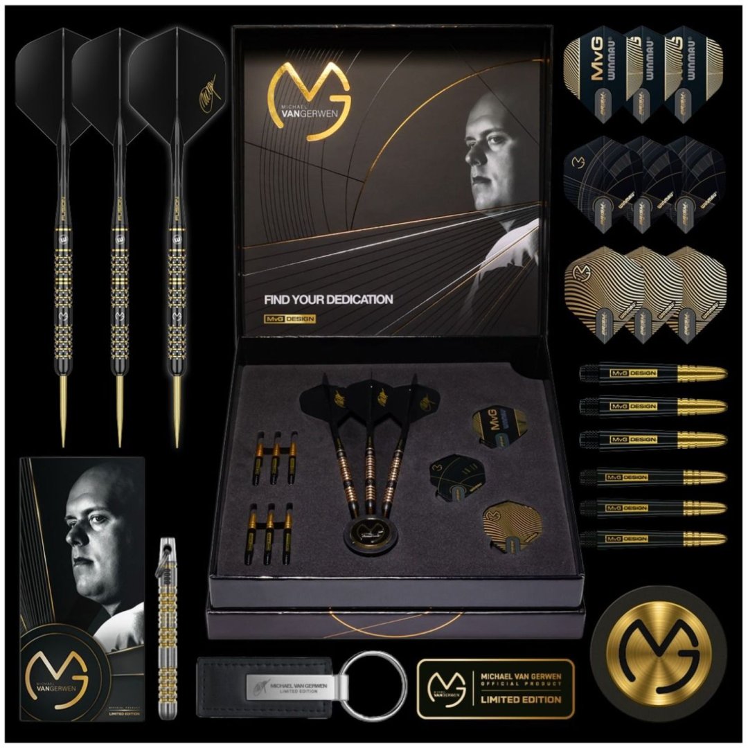 Michael van Gerwen 5 Year Anniversary Limited Edition Gift Box je sběratelským snem! Tato oslavná sada z limitované edice se dodává v elegantním a luxusním dárkovém boxu. Steelové šipky z 90% wolframu jsou inspirovány Michaelovými šipkami. Barrely šipek mají černý onyxový povrch a drážky jsou zvýrazněny zlatou barvou, což šipce přidává na eleganci. Abyste si tuto limitovanou edici šipek mohli skutečně přizpůsobit, je k ní dodávána řada příslušenství, které zahrnuje dvě sady limitované edice násadek MvG Vecta, 3 sady limitované edice letek MvG Pro Design a jedinčná integrovaná letka s násadkou s podpisem MvG. Dárková krabička navíc obsahuje také brožurku k výročí MvG, plaketu s podpisem MvG a jedinečný přívěšek na klíče s barrelem šipky MvG.