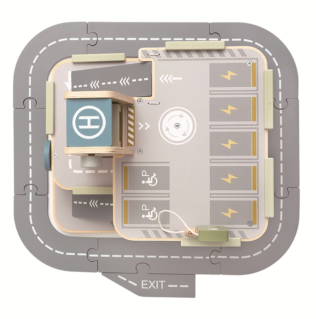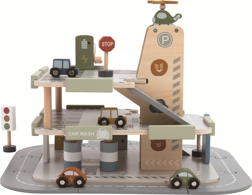 Všem automobilovým nadšencům se rozzáří oči, až uvidí garáž se silnicí, výtahem a heliportem. Umístěte dopravní značky, připravte svá autíčka a hra může začít.Všem automobilovým nadšencům se rozzáří oči, až uvidí garáž se silnicí, výtahem a heliportem. Umístěte dopravní značky, připravte svá autíčka a hra může začít. Umyjte svůj vůz v auto-myčce. Natankujte pohonné hmoty u stojanu v přízemí. Máte elektro auto? Žádný problém, vyvezte svůj vůz pomocí výtahu a připojte ho k nabíječce ve druhém patře. Baterie je plná? Tak můžete vyrazit. Stala se nehoda? Z heliportu na střeše už startuje vrtulník.