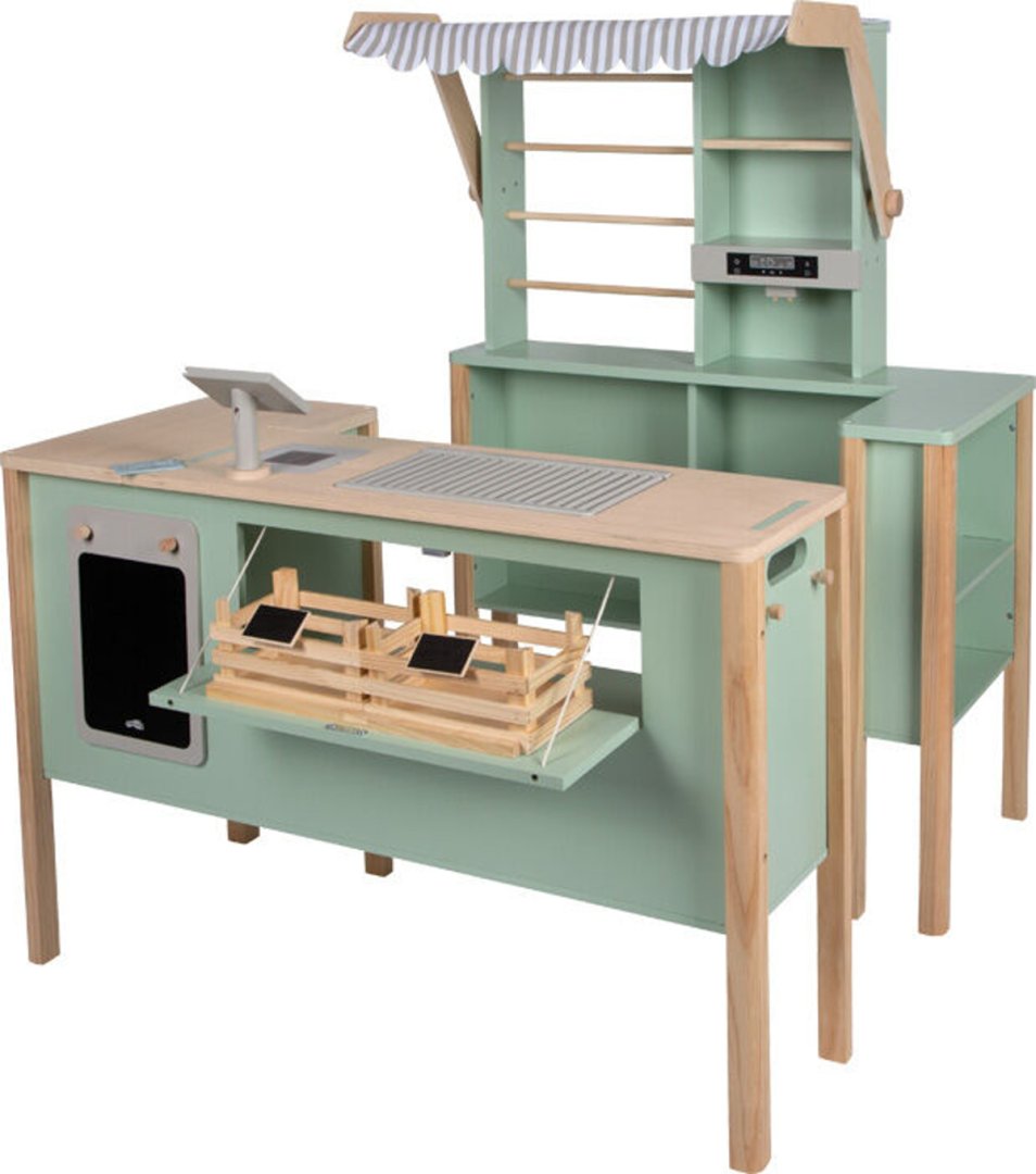 Obchod a kuchyňka z kolekce Tasty se stanou skutečně nepostradatelnou součástí každého mladého kuchaře či obchodníka.Obchod a kuchyňka z kolekce Tasty se stanou skutečně nepostradatelnou součástí každého mladého kuchaře či obchodníka. Vytvořte si obchod, kiosek s občerstvením, stánek na trhu, kuchyň či kavárnu. S touto všestrannou hračkou jsou možnosti nekonečné! Komplexní vybavení s pokladním displejem, kávovarem, dřezem či skenovací plochou, grilem, sporákem či pokladním pásem a troubou nebo lednicí, jak zrovna potřebujete. Realistická zábava při hraní je zaručena! Díky modulárnímu designu lze prvky flexibilně uspořádat tak, aby si mohlo hrát více dětí najednou. Po dni plném prodejních a kuchařských dobrodružství lze kuchyňku s obchodem složit k sobě, abyste ušetřili místo. Detaily jako je odnímatelný kryt markýzy, prodejní košíky, cenovky či nástěnka s nabídkami přidávají této hračce na autenticitě.