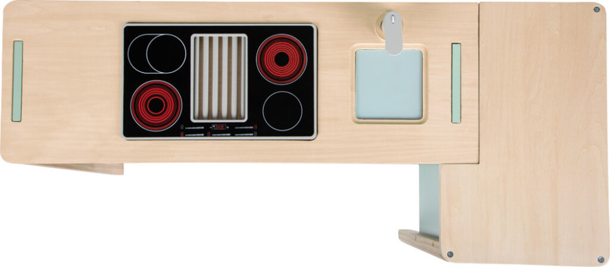 Kuchyňka /Obchod obsahuje: 1 skenovací oblast s displejem, 1 kohoutek, 1 kávovar, 1 dřez / pokladnu, 1 gril / sporák / pokladní pás, 1 troubu / ledničku, 2 prodejní košíky s cenovkami, 1 nástěnku s nabídkami, 1 odnímatelnou markízu