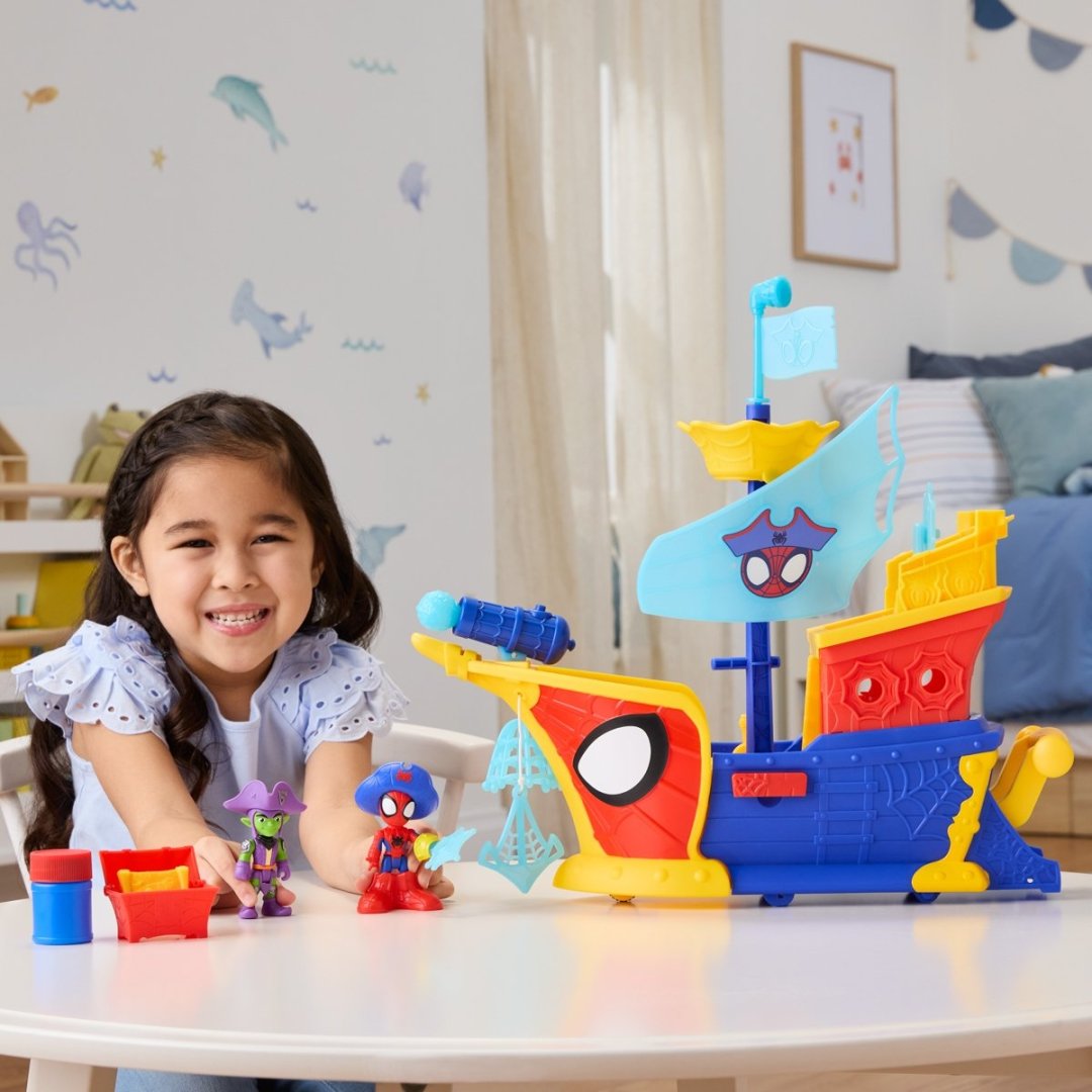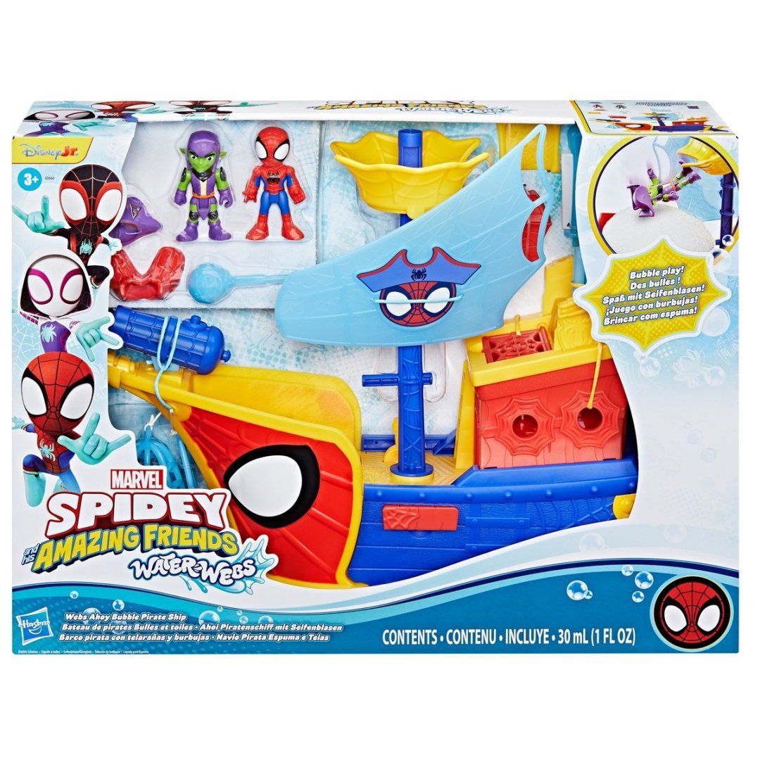 Děti si mohou představovat dobrodružství na moři s herní sadou Spidey and his Amazing Friends – Pirátská loď Webs Ahoy s bublinkami. Herní set obsahuje past na bubliny, otáčivý stožár a pozorovatelnu, výsuvné prkno a další prvky. Součástí sady jsou pohyblivé figurky superhrdinů Spideyho a Green Goblina o velikosti 7,6 cm s odnímatelnými doplňky – včetně: 2 pirátských klobouků, 1 páru pirátských bot, truhly s pokladem, mapy, lahvičky s bublinkovou tekutinou a dalších doplňků. Po použití stačí pirátskou loď s bublinkami jednoduše opláchnout a důkladně vysušit (podrobnosti viz návod).