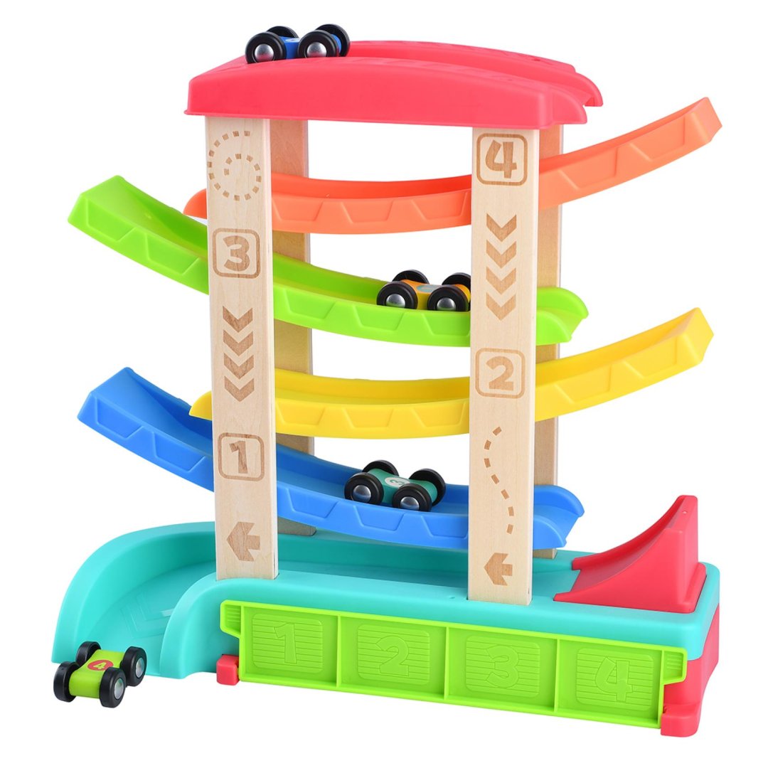 Závodní kaskádová dráha pro auta. Součástí jsou čtyři auta.