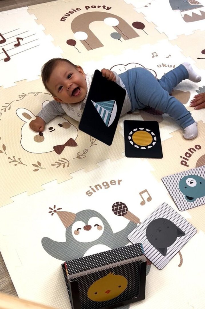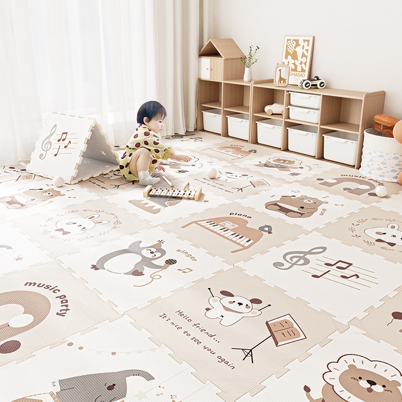 Hrací pěnová podložka se skládá z 9 čtverců se snadno spojí do praktické a pohodlné plochy pro hraní o velikosti 180 x 180 cm.Hrací pěnová podložka se skládá z 9 čtverců se snadno spojí do praktické a pohodlné plochy pro hraní o velikosti 180 x 180 cm. Podložka je vyrobena z měkkého a bezpečného materiálu, který poskytuje dětem pohodlí a ochranu při pohybu na zemi. Na jednotlivých dílech jsou roztomilá zvířátka stylizovaná jako hudebníci, obklopená motivy hudby a notami, které podporují dětskou představivost a radost z objevování.