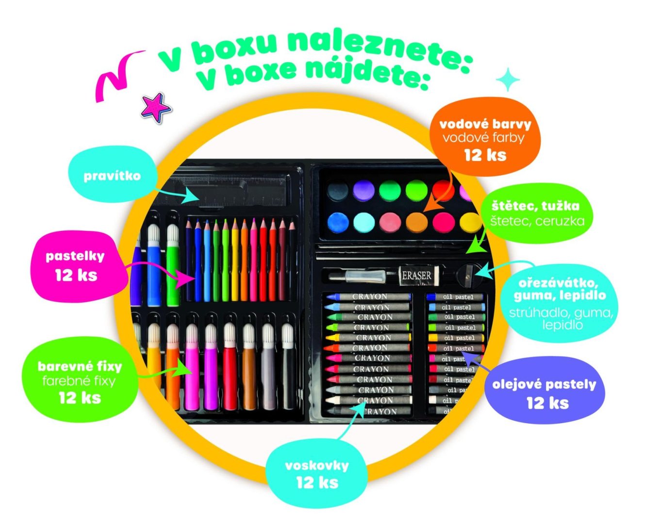 S tímto kufříkem mají malí umělci vše po ruce – a mohou tvořit kdykoli a kdekoli. Ideální na doma, na cesty i do školky. Plný pastelek, fixů, vodovek a dalších pomůcek, které rozvíjejí dětskou fantazii.EAN: 8592190805234