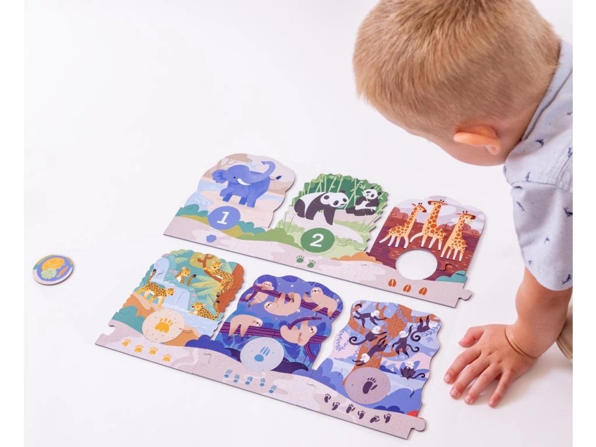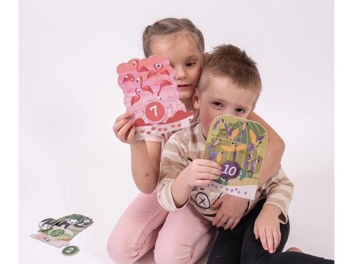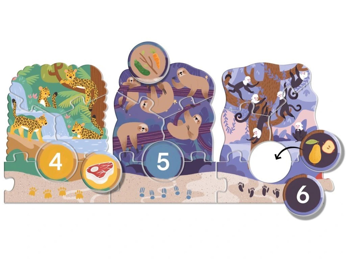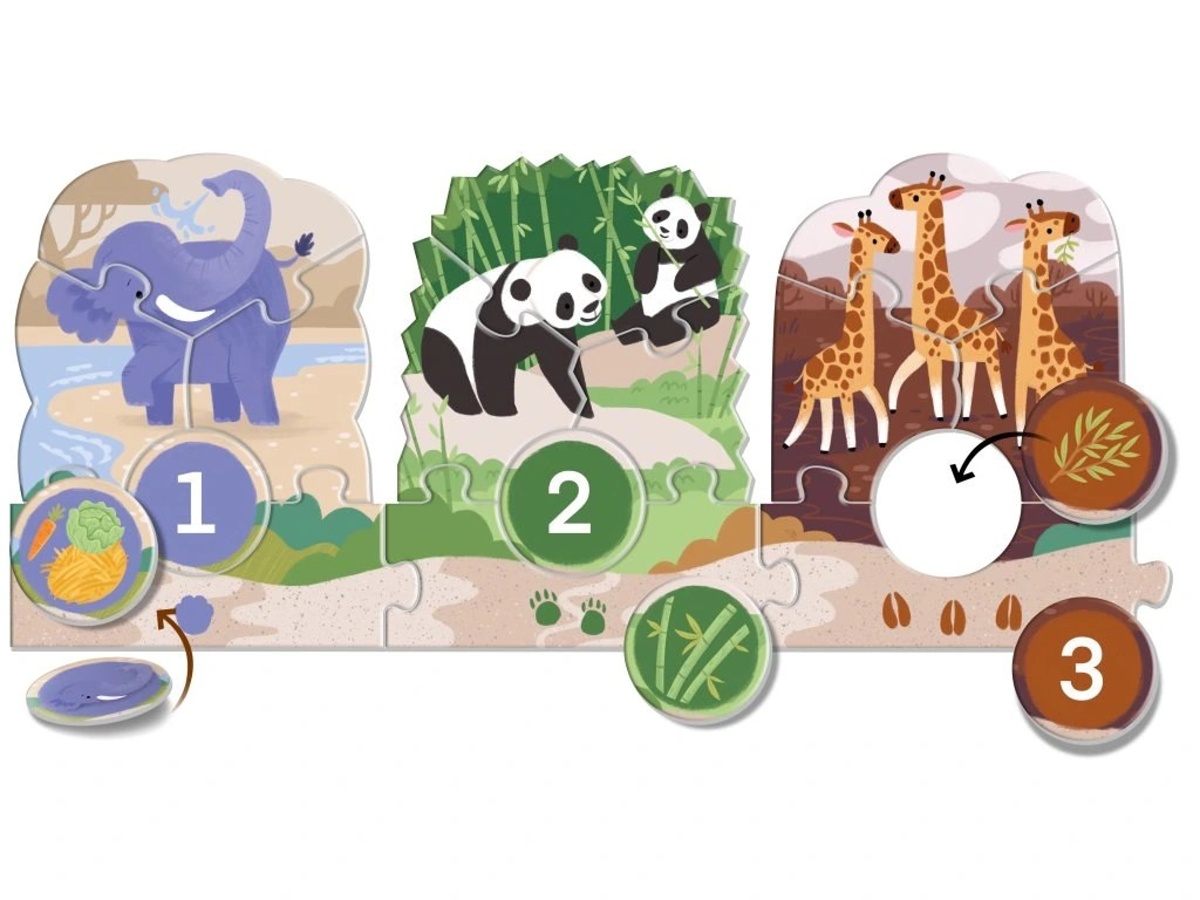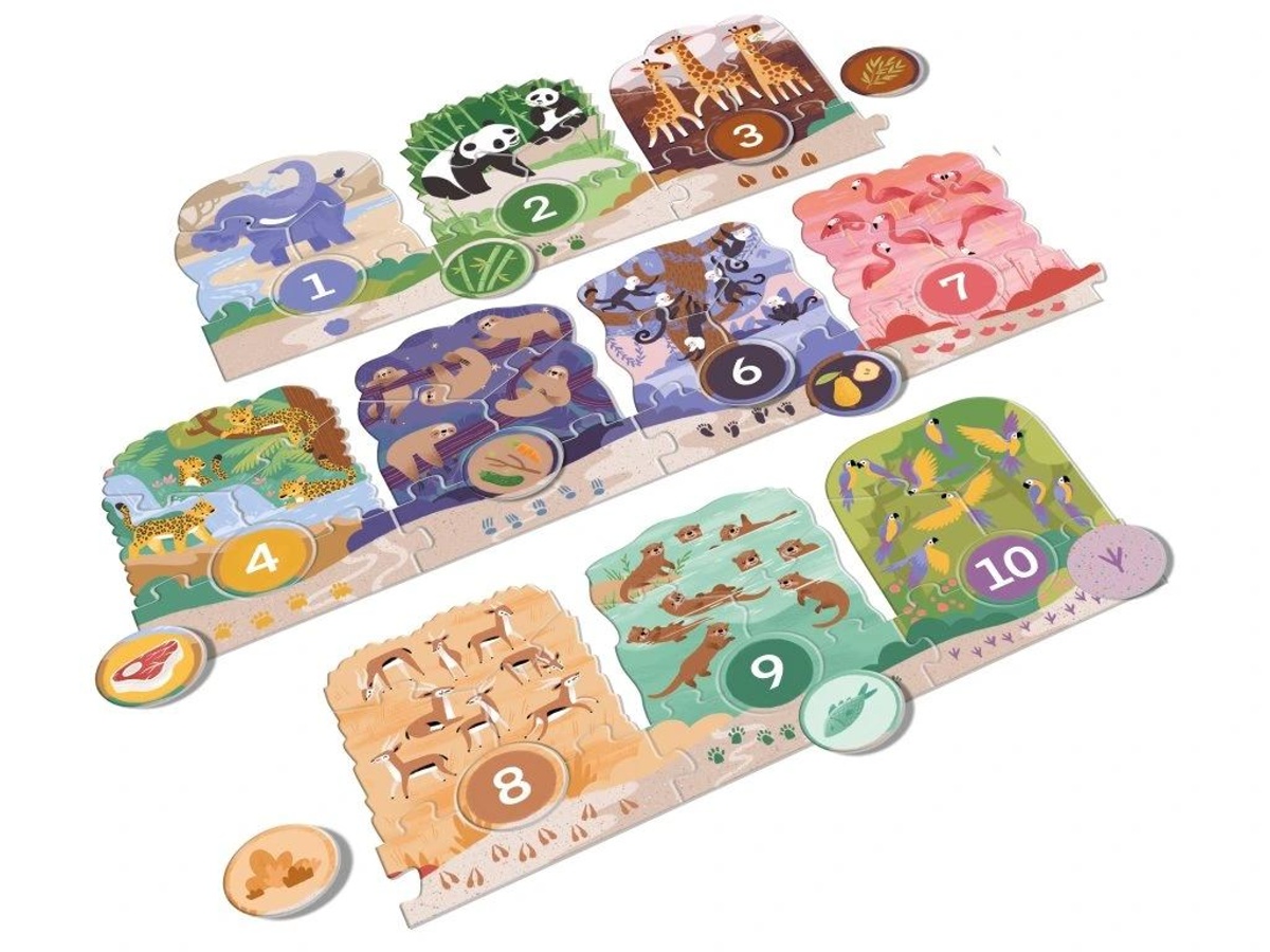 Nápadité puzzle pro děti od 2 let spojuje skládání, logické třídění a první počítání. Děti skládají 10 zvířecích výběhů ze ZOO a přiřazují k nim žetony se stopami, krmením nebo číslicemi. Součástí jsou i 4 zvířecí figurky pro další hraní. Extra velké kartičky z 2 mm silného kartonu se snadno drží i těm nejmenším – hra je ideální pro malé dětské ručičky. Hra rozvíjí logické myšlení, poznávání, zrakové vnímání i základní matematické dovednosti.
