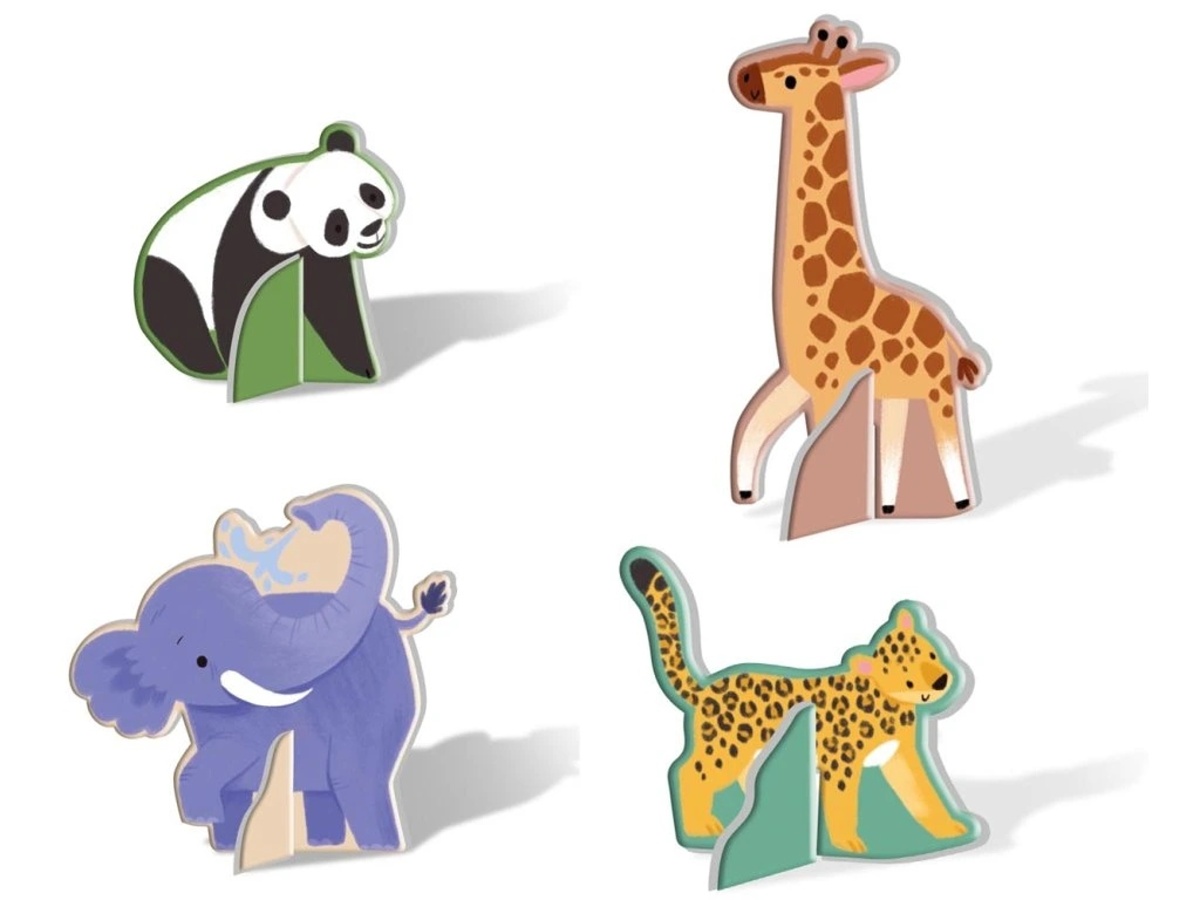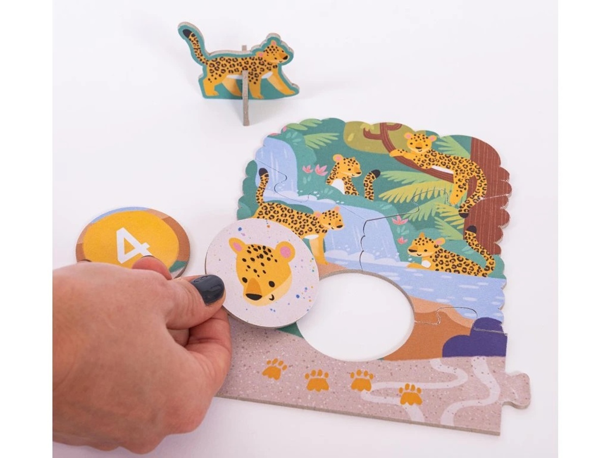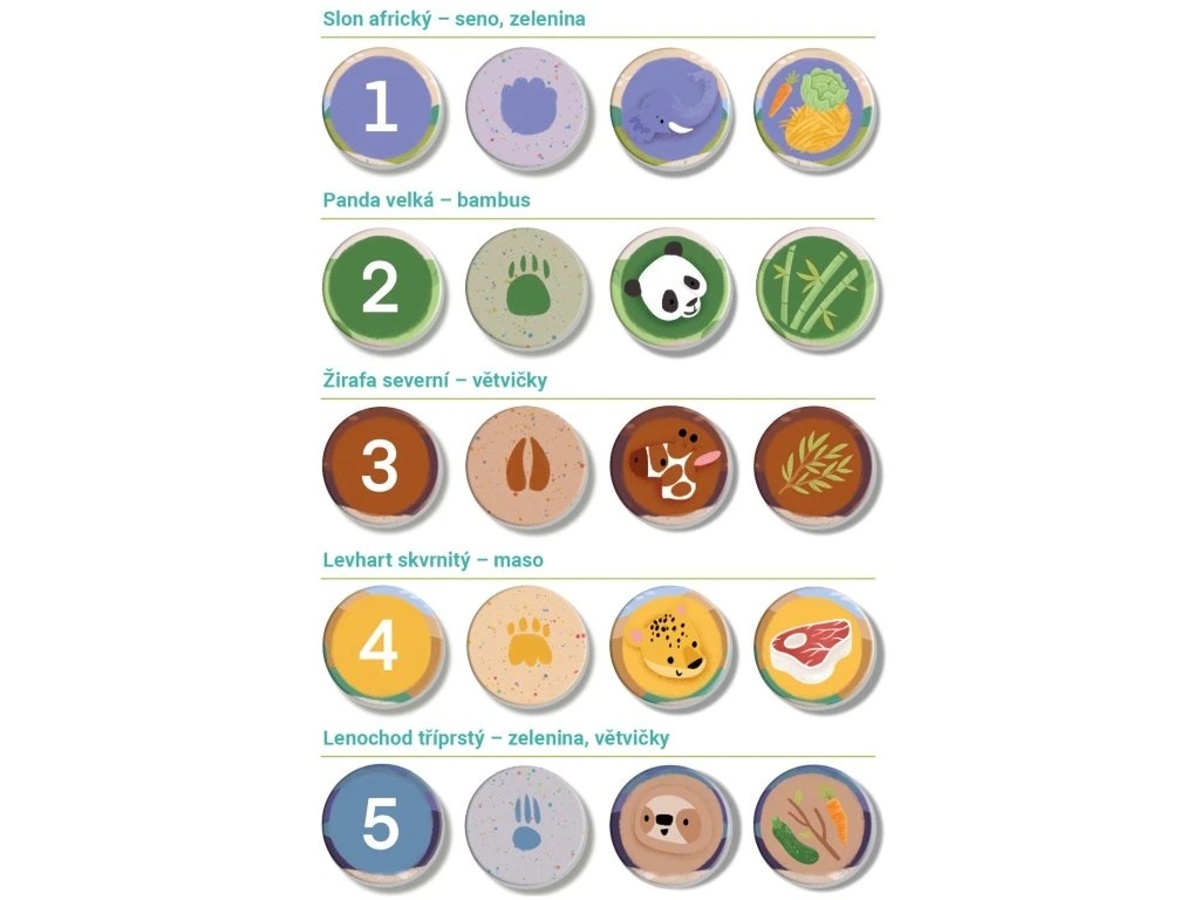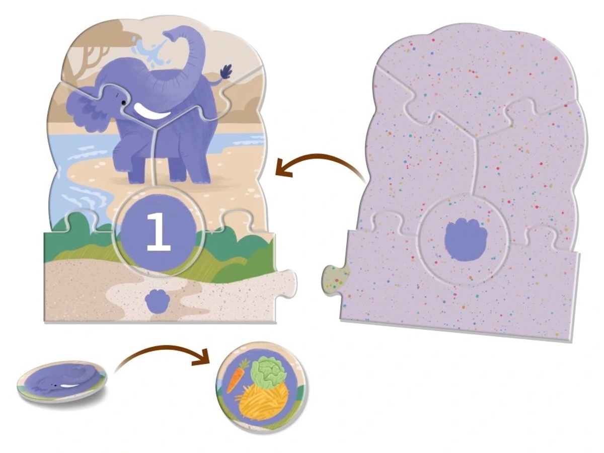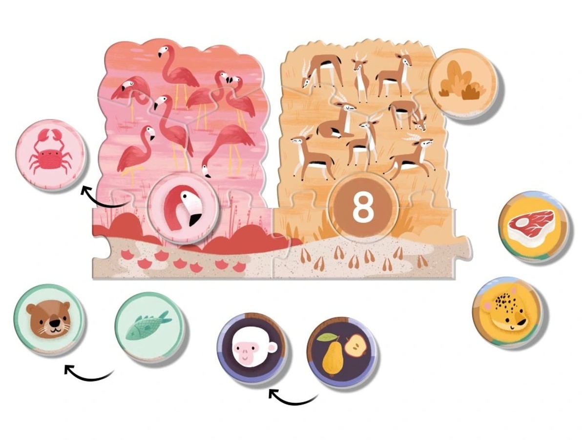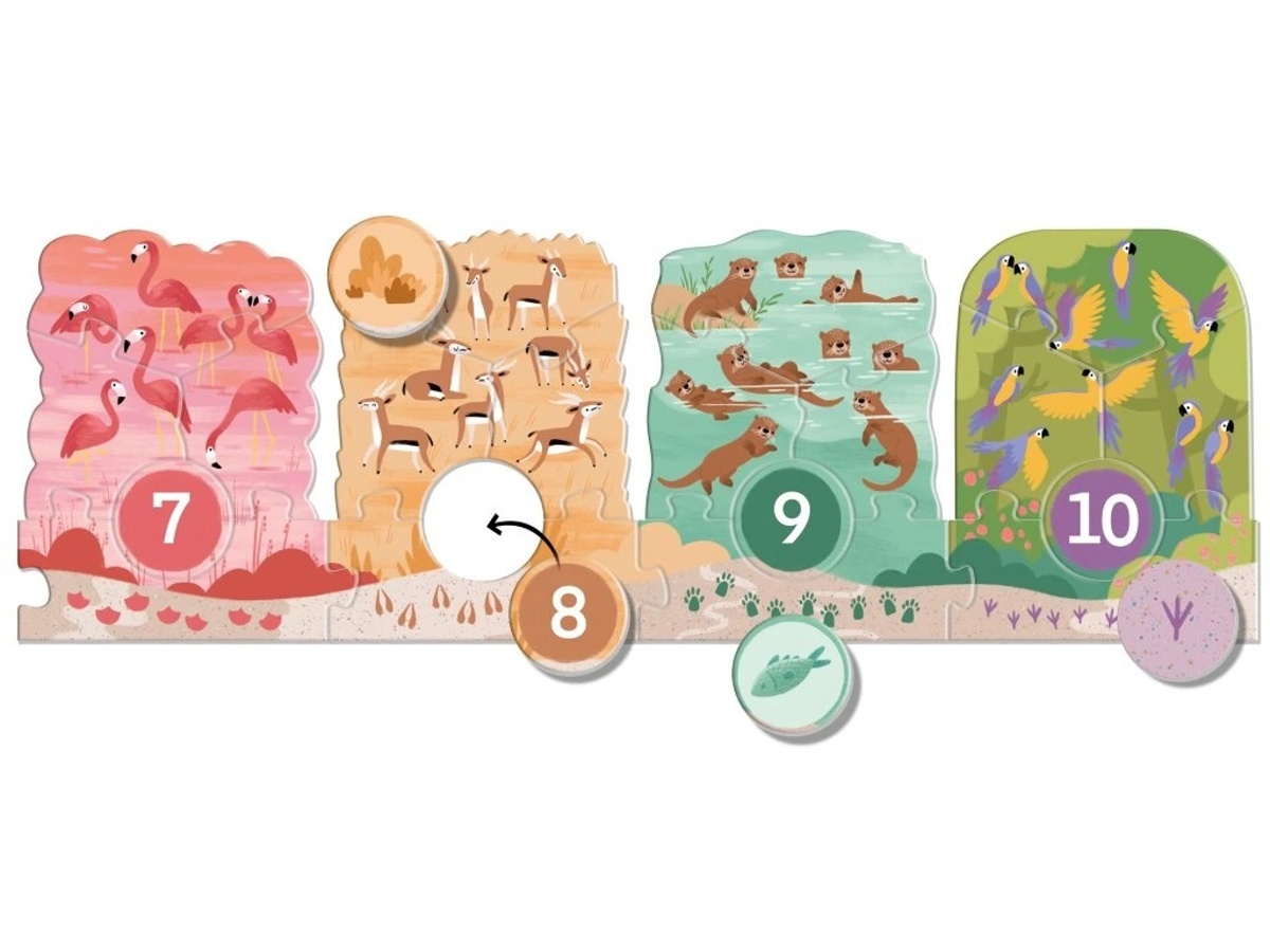 Nápadité puzzle pro děti od 2 let spojuje skládání, logické třídění a první počítání. Děti skládají 10 zvířecích výběhů ze ZOO a přiřazují k nim žetony se stopami, krmením nebo číslicemi. Součástí jsou i 4 zvířecí figurky pro další hraní. Extra velké kartičky z 2 mm silného kartonu se snadno drží i těm nejmenším – hra je ideální pro malé dětské ručičky. Hra rozvíjí logické myšlení, poznávání, zrakové vnímání i základní matematické dovednosti.