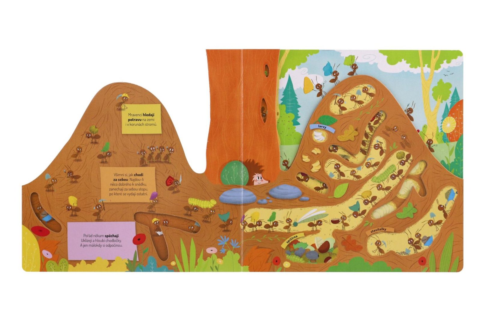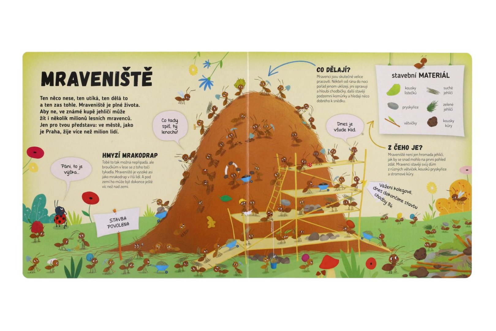 Poznej život v mraveništi! Představ si, že jsi mravenec a strávíš jeden den v mraveništi. Jaké to asi bude? Celý den budeš pořád někam utíkat – uklízet a hloubit chodbičky, hledat různá semínka, abys měl co jíst, a až tě to přestane bavit, vylezeš si úplně nahoru na vršek mravenčí kupy, aby ses opaloval a nahříval si tělíčko. Ale dost už bylo řečí. Víš co? Udělej si pohodlí a pojď se s námi podívat přímo do mraveniště…