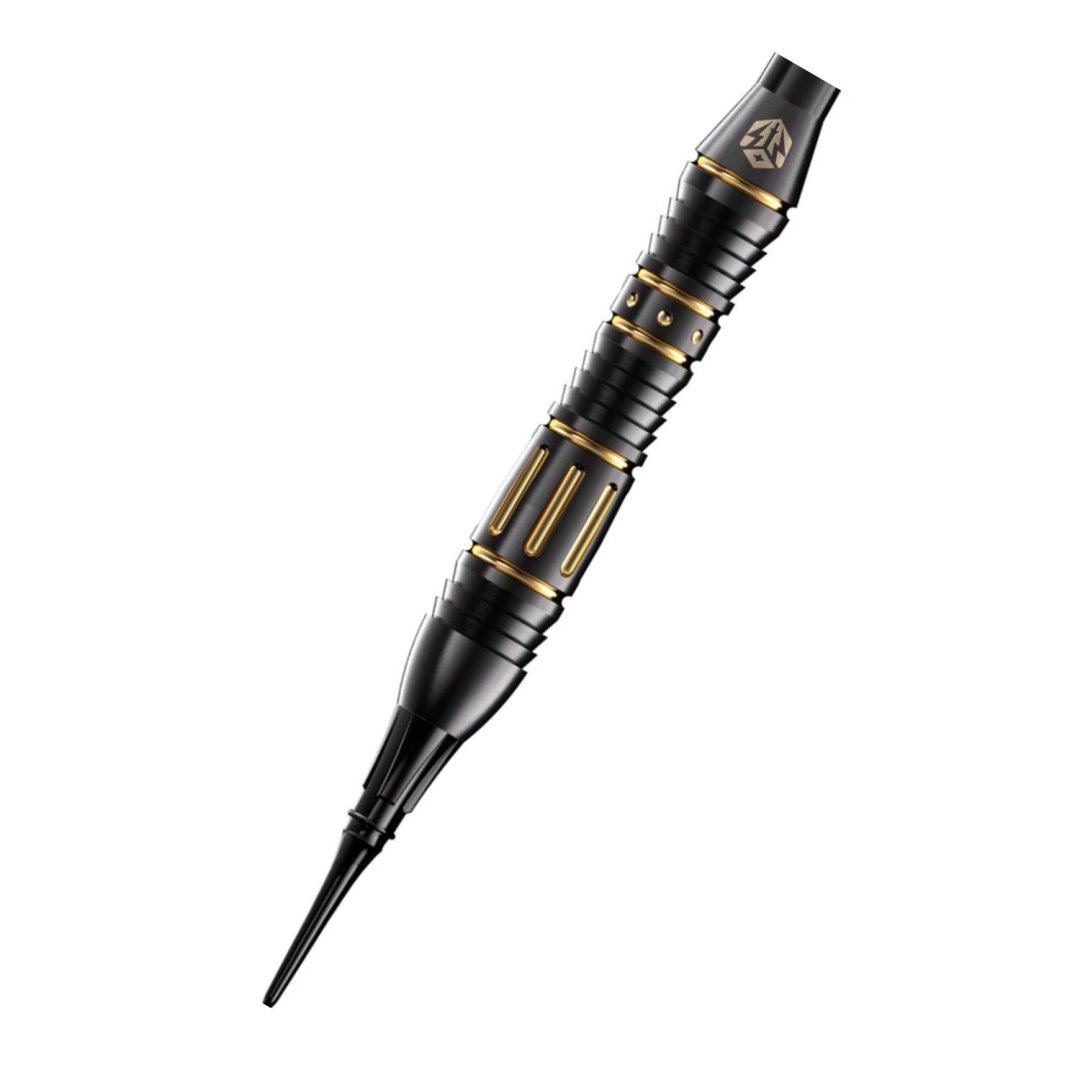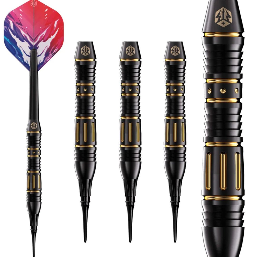 Softové šipky Caliburn Combo jsou mosazné šipky v ohromujícím designu. Černé barrely mají jedinečné zlaté drážky, které šipce dodávají elegantní vzhled.