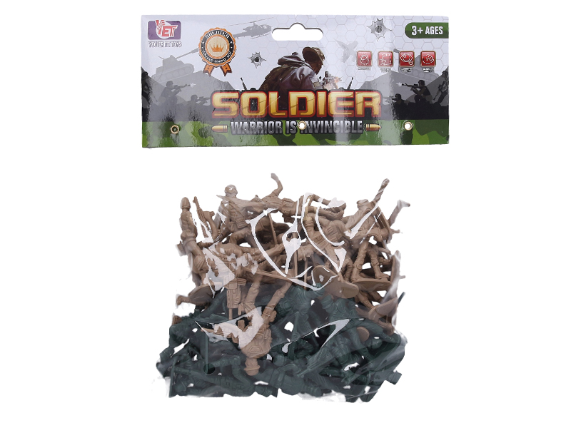 V sáčku najdete desítky plastových figurek vojáků ve dvou barvách a různých bojových pozicích, což umožňuje zinscenovat realistické bitvy dvou soupeřících armád.