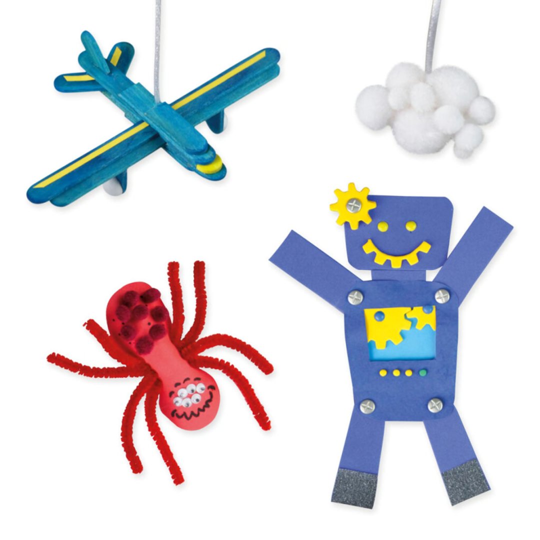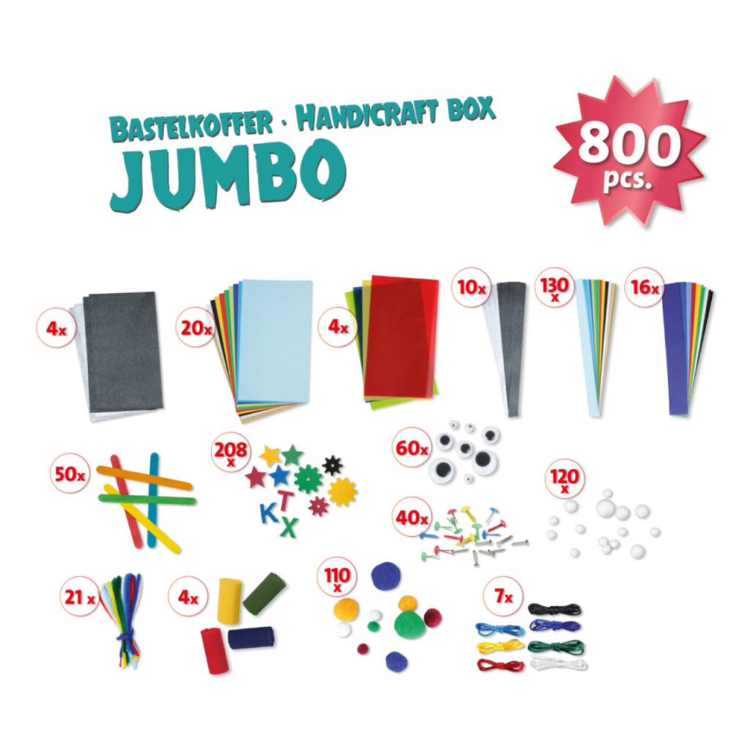 Kufřík pro malé kutily obsahuje barevný papír, díly z pěnové gumy, čističe dýmek, kroutící oči, bambulky, krepový papír, barevné tyčinky od nanuku, knoflíky a mnoho dalšího.