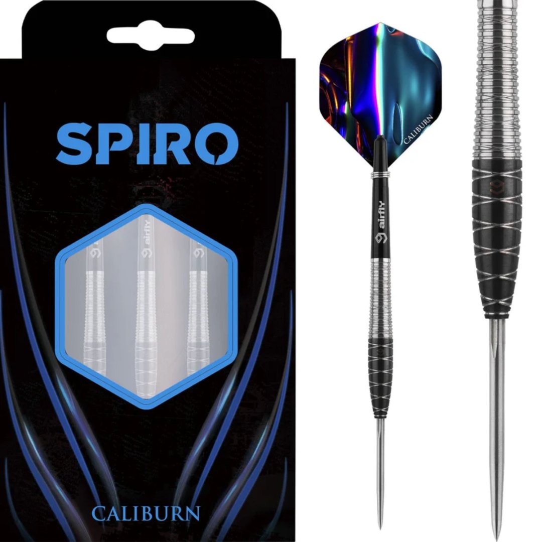 Steelové šipky Caliburn Spiro jsou wolframové šipky (90% tungsten) s černo-stříbrnými barrely v originálním designu. Barrely jsou doplněny nylonovými násadkami a letkami Caliburn. Šipky mají vyměnitelný systém hrotů Caliburn Replaceable Point System. Součástí balení NENÍ klíč pro výměnu hrotů Caliburn (X1997).