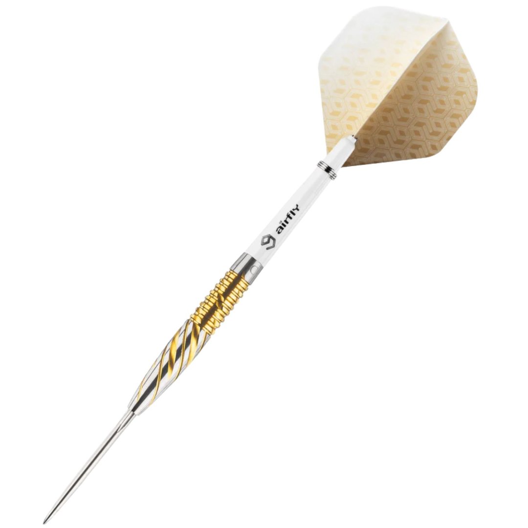 Steelové šipky Caliburn Nexus jsou wolframové šipky (95% tungsten) v úchvatném designu. Barrely mají drážkování zvýrazněné zlatou barvou.