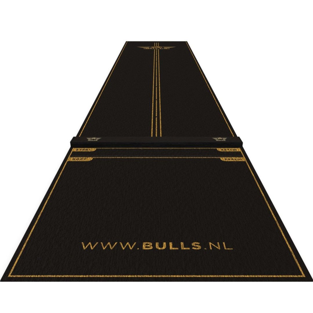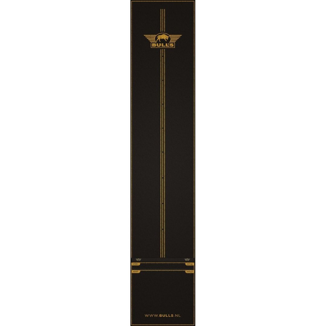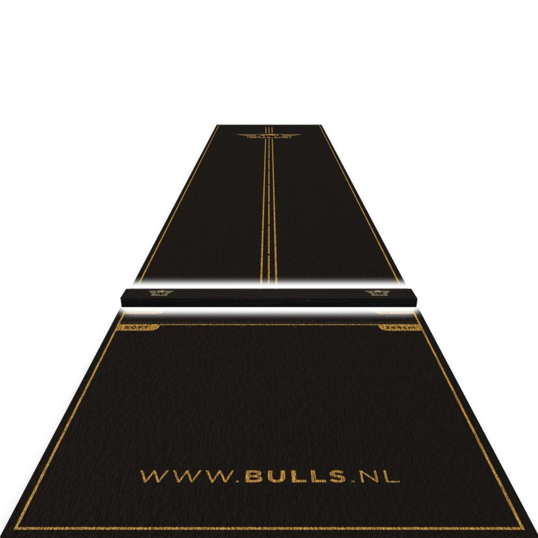 Koberec Bull's Advantage Dartmat + oche je navržen tak, aby vám poskytl ještě lepší zážitek ze hry díky kombinaci stylu, pohodlí a přesnosti. Tento prémiový koberec o rozměrech 300 x 85 cm nabízí dostatek prostoru a profesionální vlastnosti, díky čemuž je vynikající volbou jak pro rekreační, tak pro profesionální hráče. Sofistikovaný černozlatý design dodá vašemu šipkařskému koutku luxusní nádech, zatímco odolný koberec poskytuje ochranu i stabilitu.