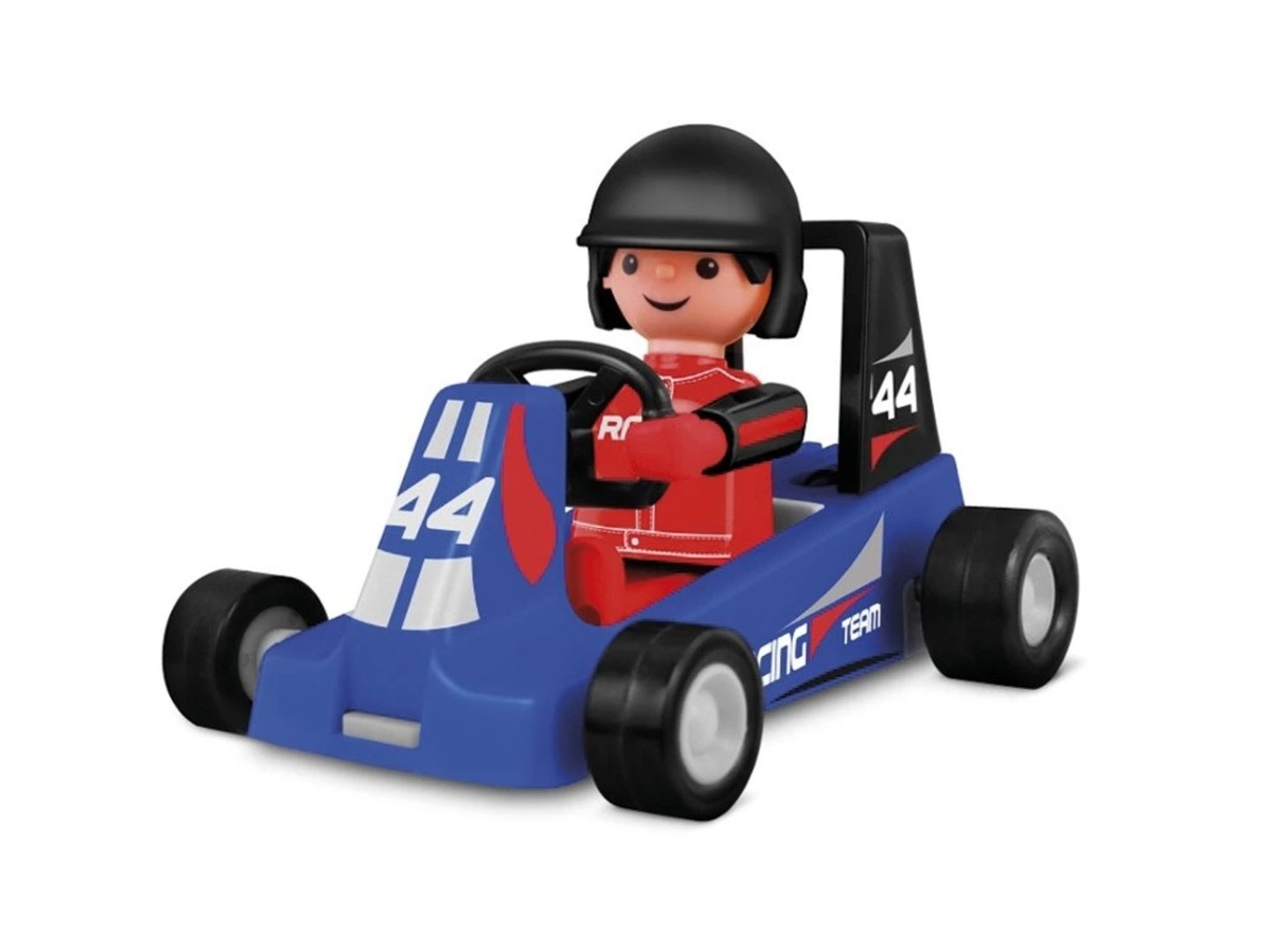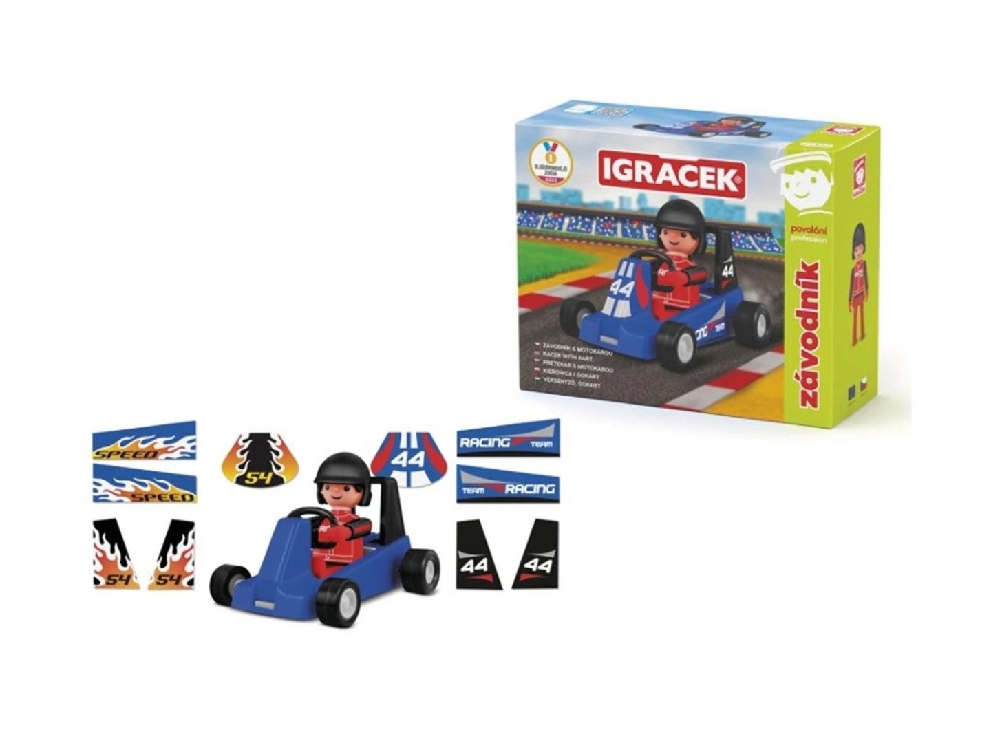 Igráček závodník je se svou motokárou již připraven na startu. Uspořádej se svými kamarády závody motokár a buď první v cíli. Hračka rozvíjí jemnou motoriku a fantazii dětí.