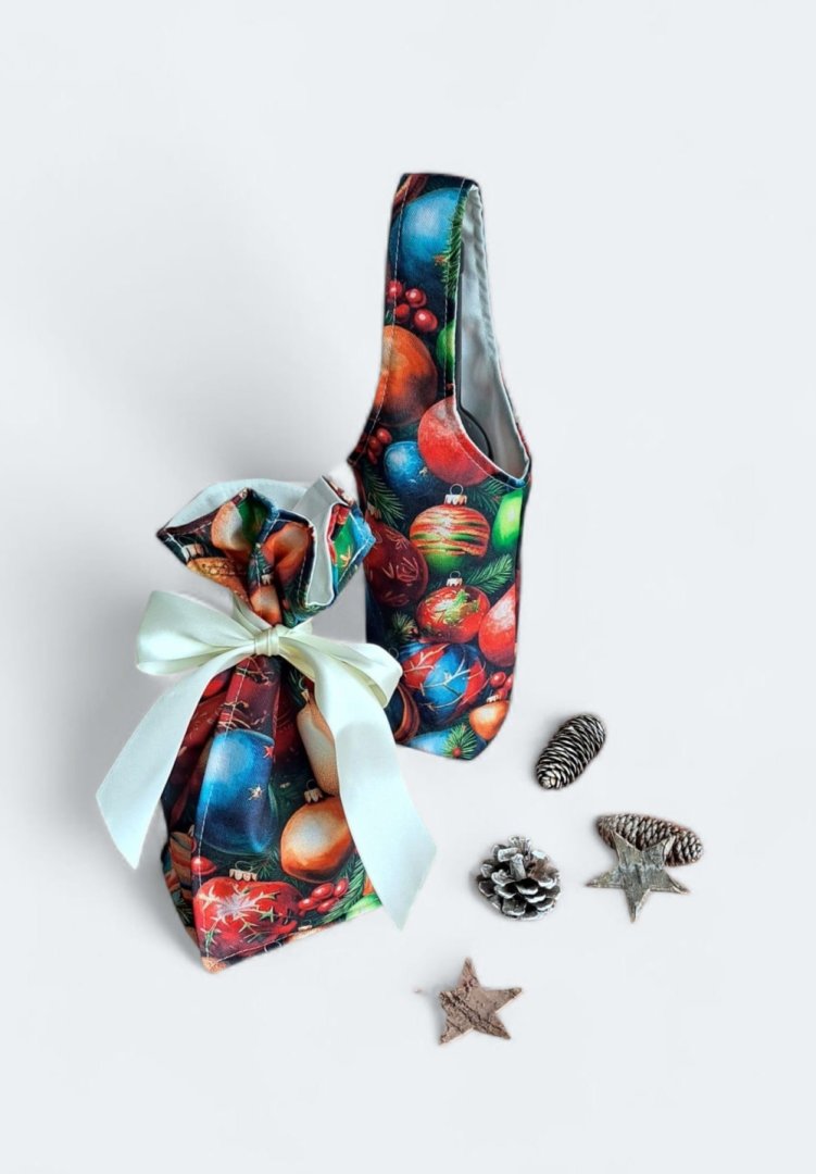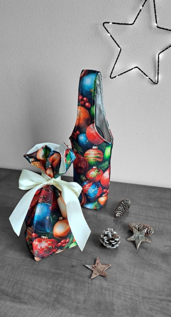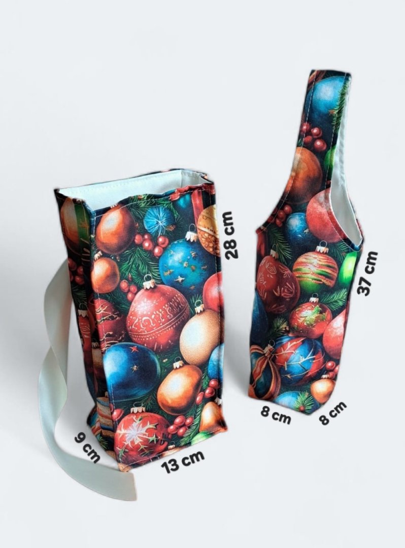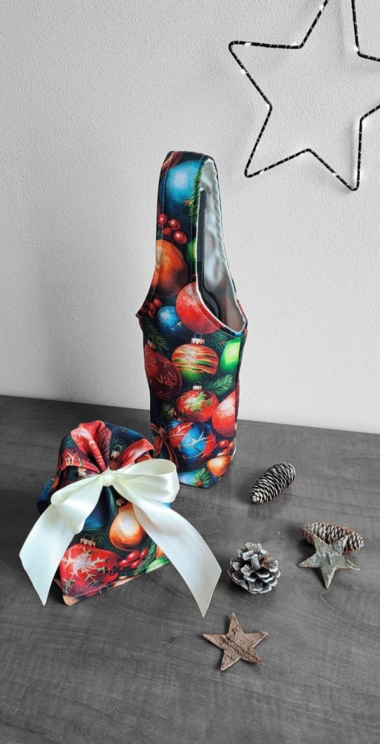 Povzneste darování vánočního dárku na novou úroveň! Tato dárková sada kombinuje luxusní vzhled s praktičností a udržitelností.Povzneste darování vánočního dárku na novou úroveň! Tato dárková sada kombinuje luxusní vzhled s praktičností a udržitelností. Sada kombinuje elegantní dárkovou tašku na lahev (víno, sekt, "bohemka") a malý pytlík na drobnosti (šperky, kosmetiku, sladkosti) s motivem zářivých vánočních ozdob. Bohatý potisk plný červených, modrých a zelených koulí a bobulí. Připravte se na kouzelné Vánoce a dodejte svému dárku punc luxusu a originality. Zapomeňte na jednorázové papírové obaly. Dárková sada s vánočními motivy je navržena pro opakované použití. Oba kusy jsou dostatečně pevné, chrání obsah a díky možnosti praní jsou skvělou alternativou k jednorázovým balicím papírům. Nabízí více způsobů zavázání, takže můžete experimentovat s mašlemi a uzly. Stylová dárková textilní sada s luxusním zimním potiskem. Ideální doplněk pro vaše vánoční dárky!
