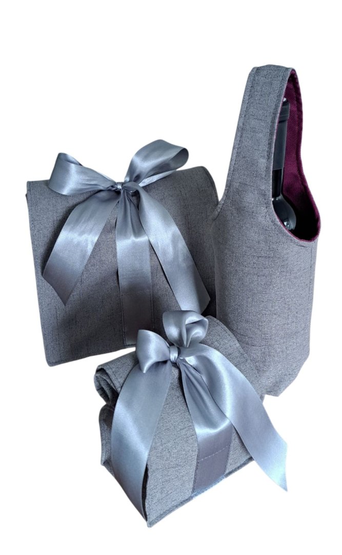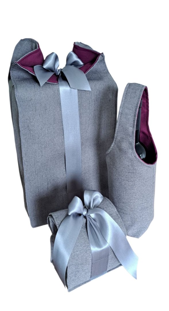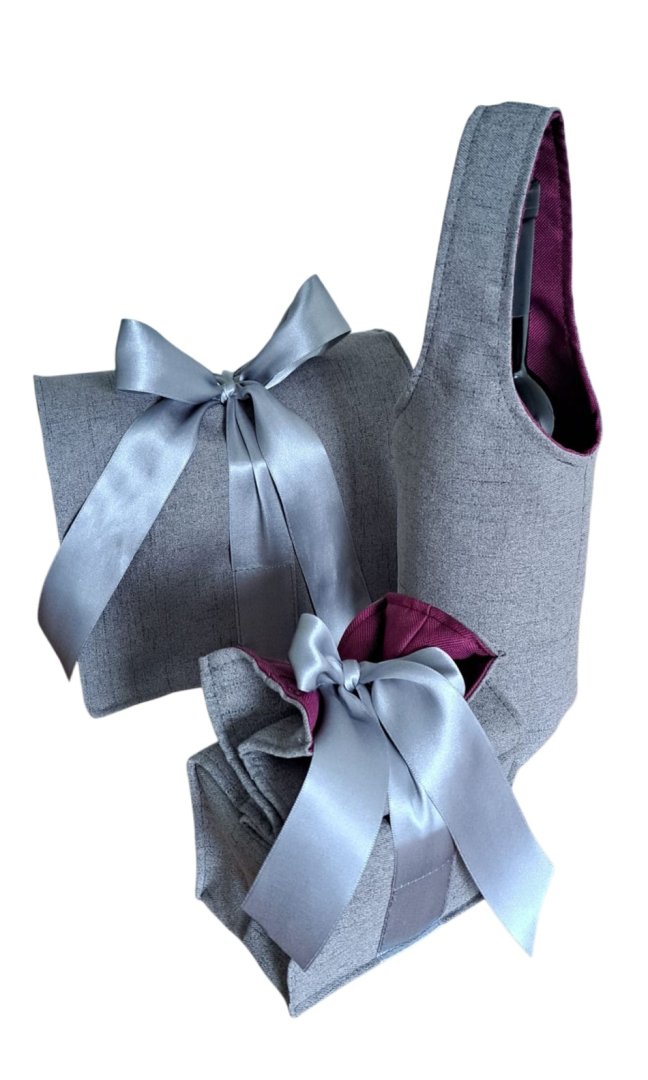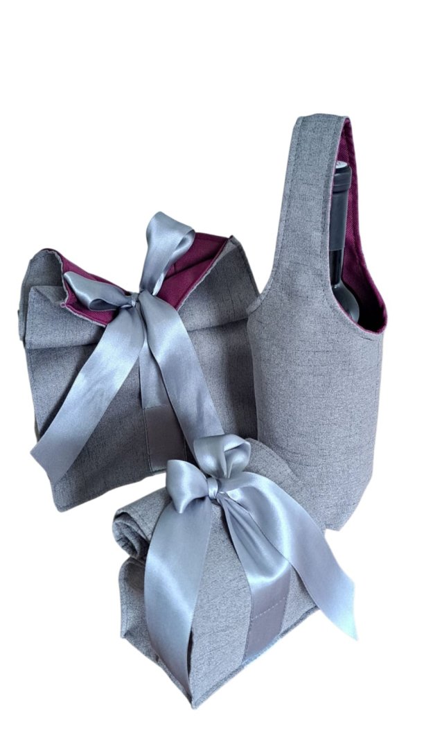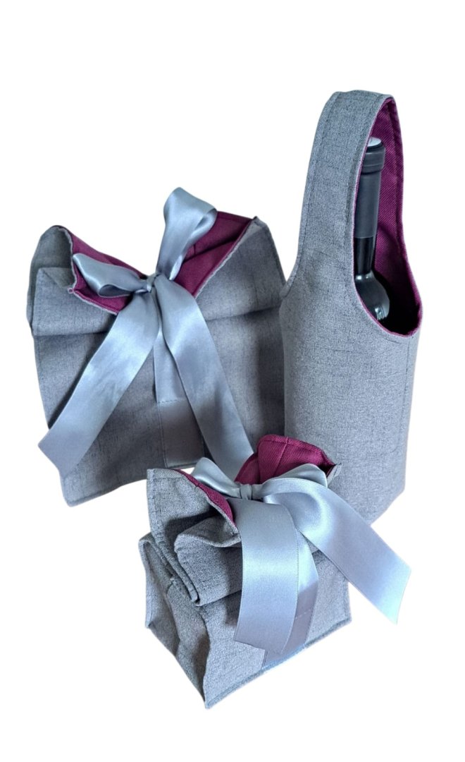 Povzneste darování na novou úroveň! Tato dárková sada kombinuje luxusní vzhled s praktičností a udržitelností.Povzneste darování na novou úroveň! Tato dárková sada kombinuje luxusní vzhled s praktičností a udržitelností. Sada kombinuje elegantní dárkovou tašku na lahev (víno, sekt, "bohemka"), velký pytlík na větší dárek a malý pytlík na drobnosti (šperky, kosmetiku, sladkosti). Všechny kusy jsou vyrobeny z odolného, pratelného polyesteru v atraktivní kombinaci šedého melíru a fialové. Jsou dostatečně pevné, chrání obsah a díky možnosti praní jsou skvělou alternativou k jednorázovým balícím papírům. Nabízí více způsobů zavázání, takže můžete experimentovat s mašlemi a uzly. Darujte s láskou a stylem, který vydrží!