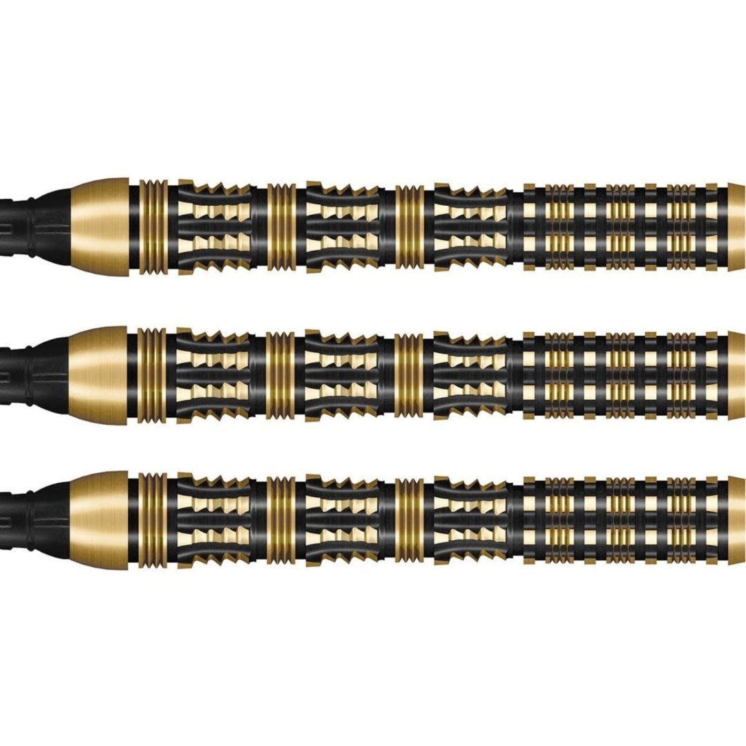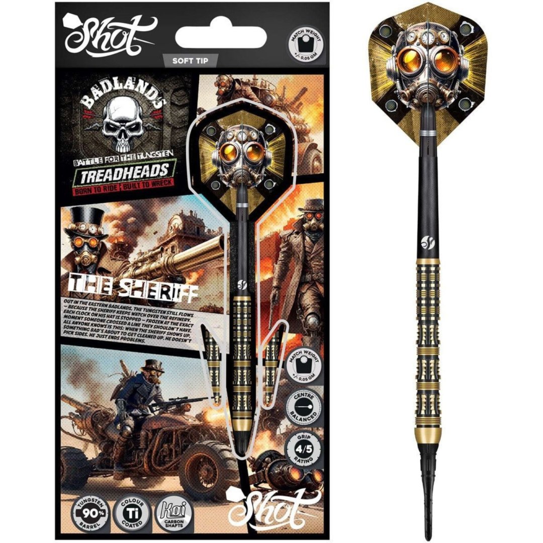 Softové šipky Shot Badlands The Sheriff jsou wolframové šipky (90% tungsten) v ohromujícím designu. Černozlaté barrely s jedinečným drážkováním dodávají šipce luxusní vzhled.