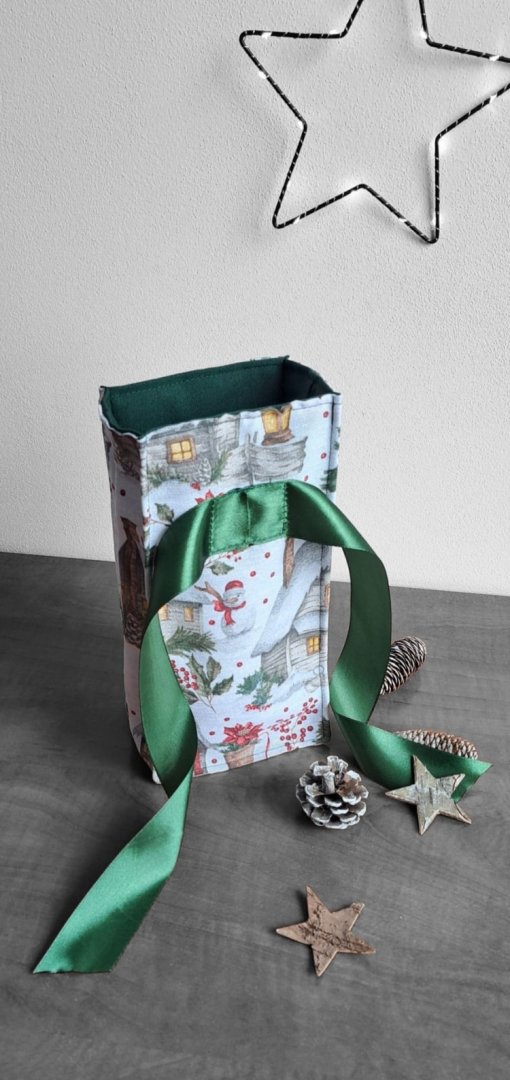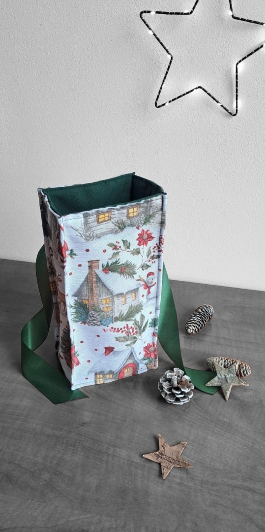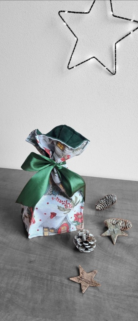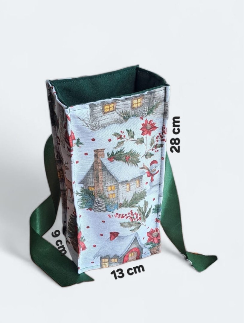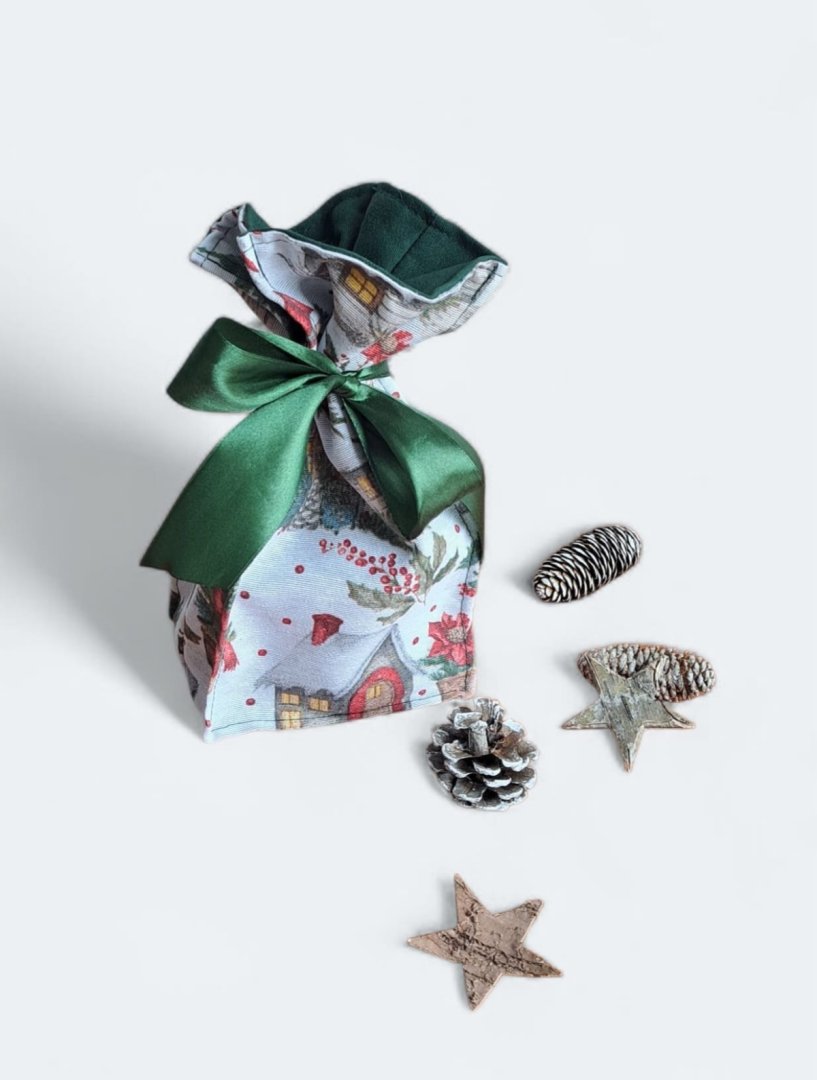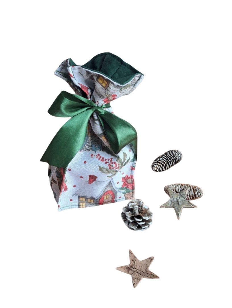Udělejte z každého malého vánočního dárku výjimečné překvapení!Udělejte z každého malého vánočního dárku výjimečné překvapení! Tento látkový pytlík s okouzlujícím zimním a vánočním motivem – zasněžené chaloupky, jehličí a červené bobule je perfektní volbou. Vnitřní strana je podšitá elegantní tmavě zelenou látkou, která ladí se sváteční atmosférou. Připravte se na kouzelné Vánoce a dodejte svému dárku punc luxusu a originality. Zapomeňte na jednorázové papírové obaly. Dárkový pytlík s vánočními motivy je navržen pro opakované použití. Je dostatečně pevný, chrání obsah a díky možnosti praní je skvělou alternativou k jednorázovým balicím papírům. Nabízí více způsobů zavázání, takže můžete experimentovat s mašlemi a uzly.