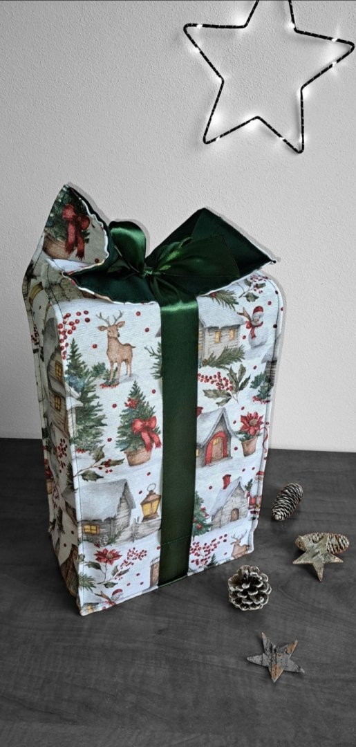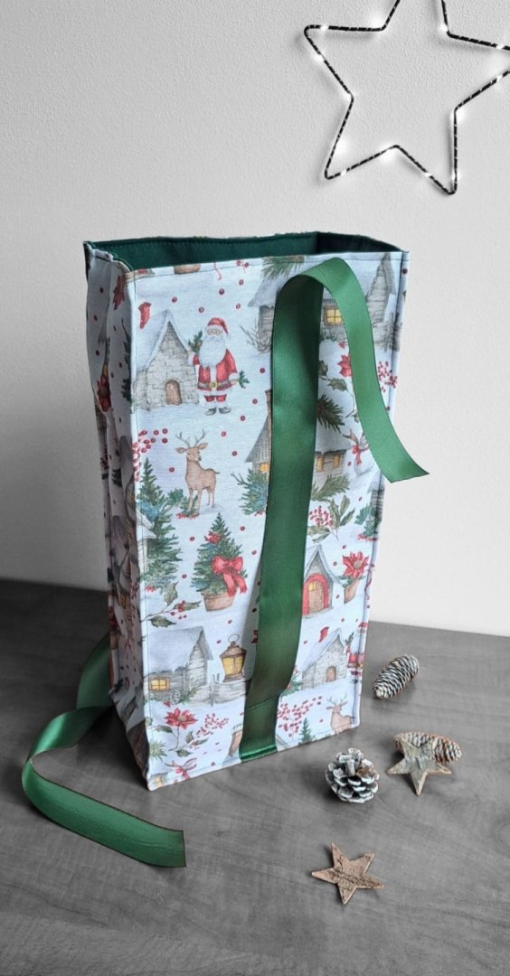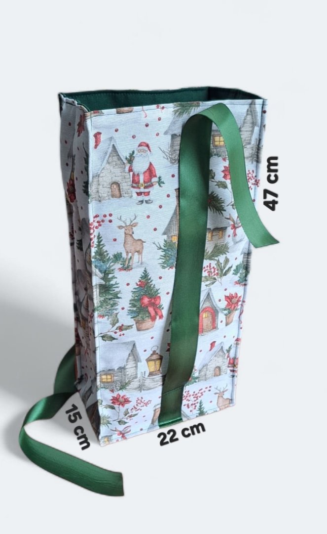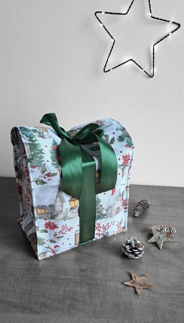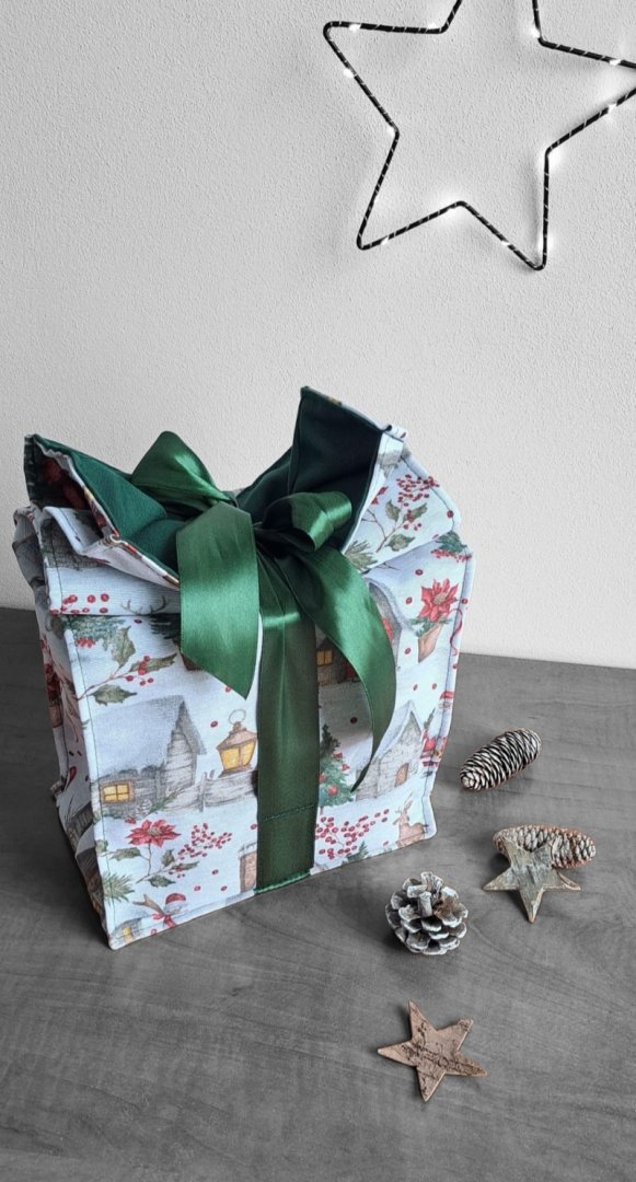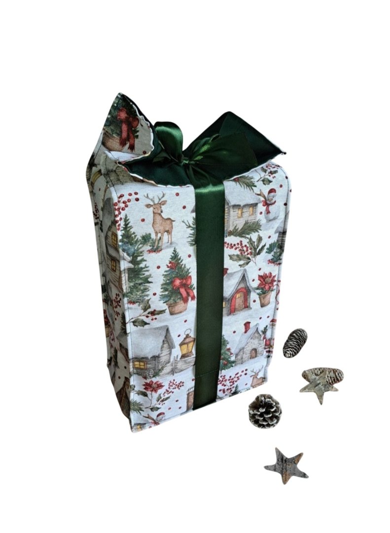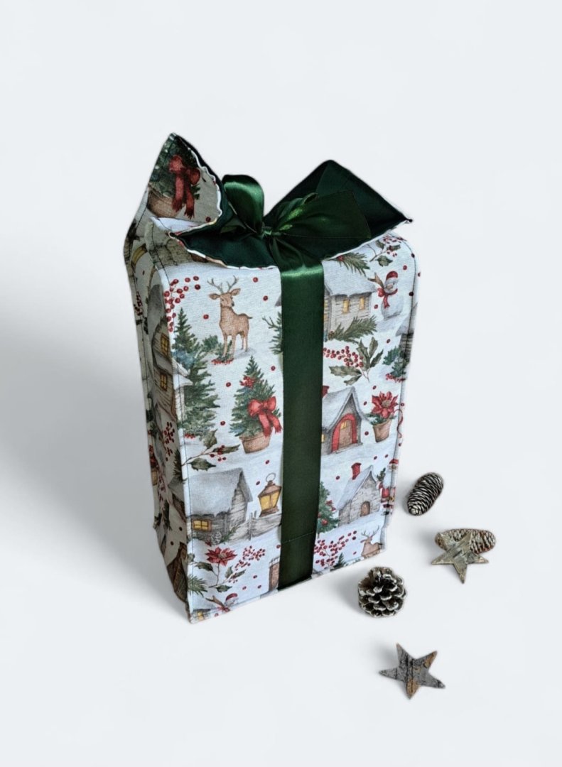 Udělejte z každého malého vánočního dárku výjimečné překvapení!Udělejte z každého malého vánočního dárku výjimečné překvapení! Tento látkový pytlík s okouzlujícím zimním a vánočním motivem – zasněžené chaloupky, jehličí a červené bobule je perfektní volbou. Vnitřní strana je podšitá elegantní tmavě zelenou látkou, která ladí se sváteční atmosférou. Připravte se na kouzelné Vánoce a dodejte svému dárku punc luxusu a originality. Zapomeňte na jednorázové papírové obaly. Dárkový pytlík s vánočními motivy je navržen pro opakované použití. Je dostatečně pevný, chrání obsah a díky možnosti praní je skvělou alternativou k jednorázovým balicím papírům. Nabízí více způsobů zavázání, takže můžete experimentovat s mašlemi a uzly.