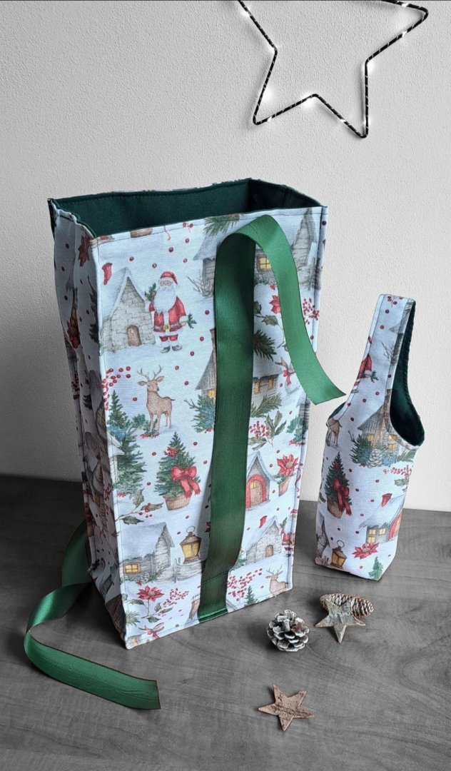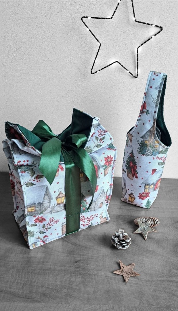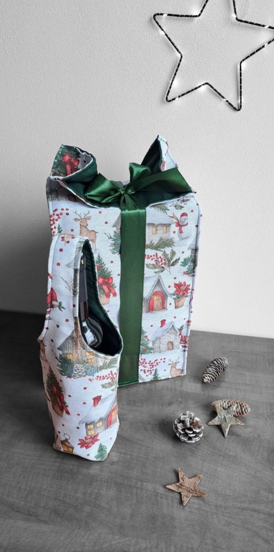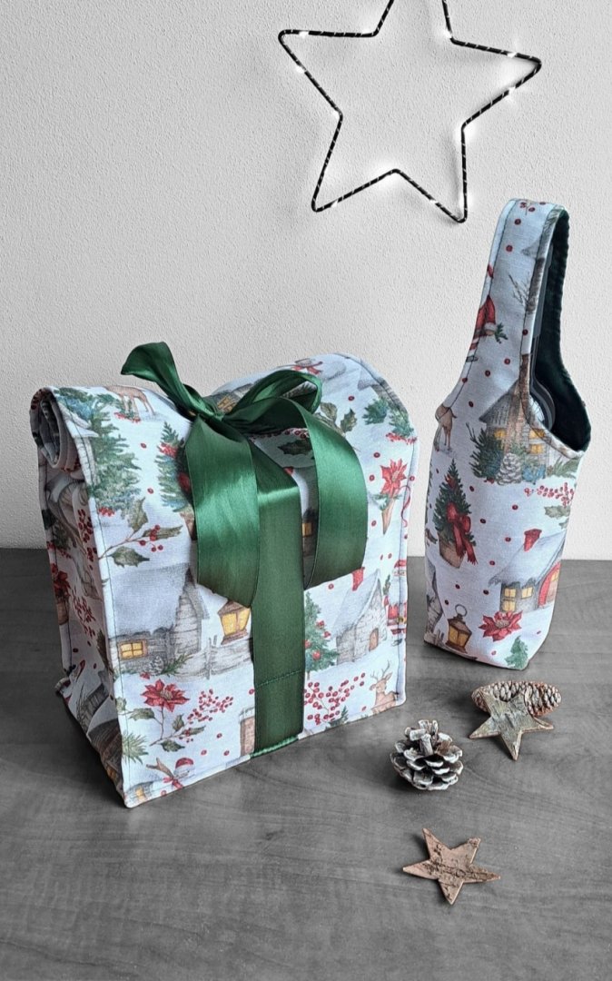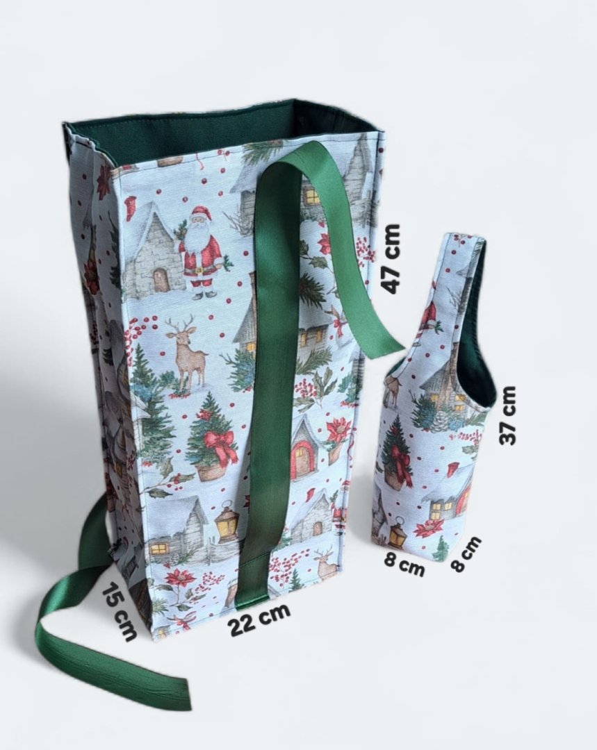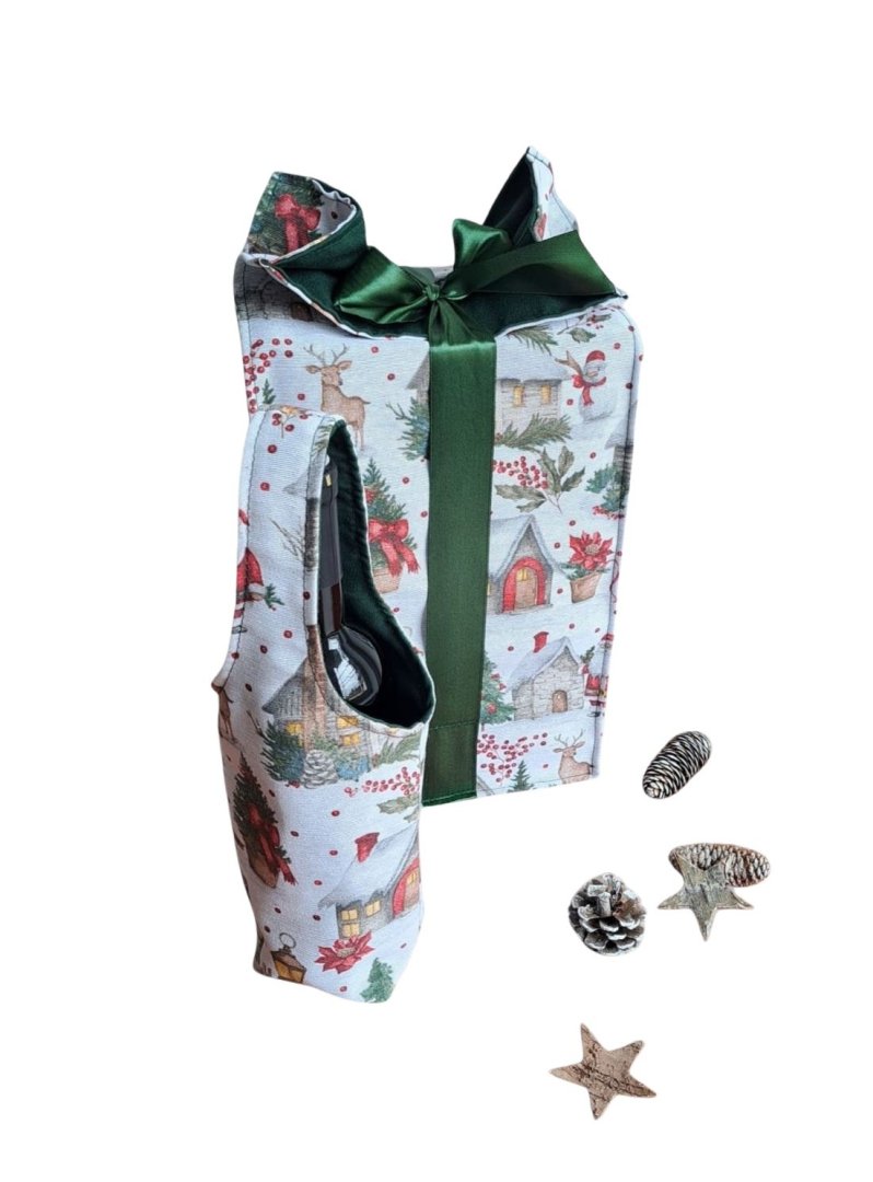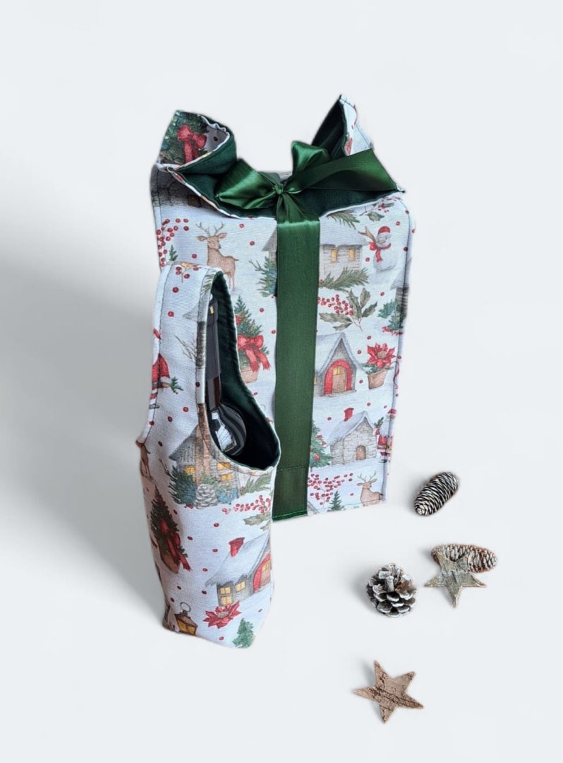 Povzneste darování vánočního dárku na novou úroveň! Tato dárková sada kombinuje luxusní vzhled s praktičností a udržitelností.Povzneste darování vánočního dárku na novou úroveň! Tato dárková sada kombinuje luxusní vzhled s praktičností a udržitelností. Sada kombinuje elegantní dárkovou tašku na lahev (víno, sekt, "bohemka") a velký pytlík na větší dárek s okouzlujícím zimním a vánočním motivem – zasněžené chaloupky, jehličí a červené bobule. Vnitřní strana je podšitá elegantní tmavě zelenou látkou, která ladí se sváteční atmosférou. Připravte se na kouzelné Vánoce a dodejte svému dárku punc luxusu a originality. Zapomeňte na jednorázové papírové obaly. Dárková sada s vánočními motivy je navržena pro opakované použití. Oba kusy jsou dostatečně pevné, chrání obsah a díky možnosti praní jsou skvělou alternativou k jednorázovým balicím papírům. Nabízí více způsobů zavázání, takže můžete experimentovat s mašlemi a uzly.
