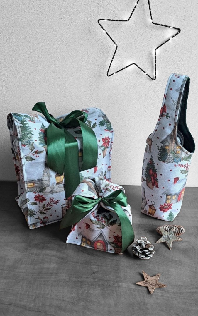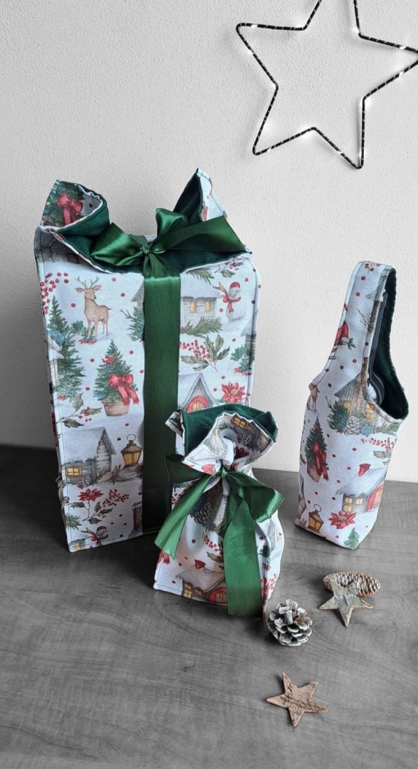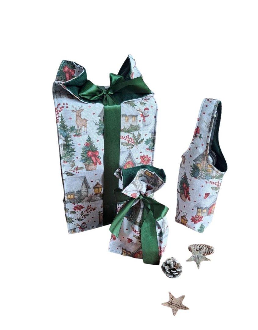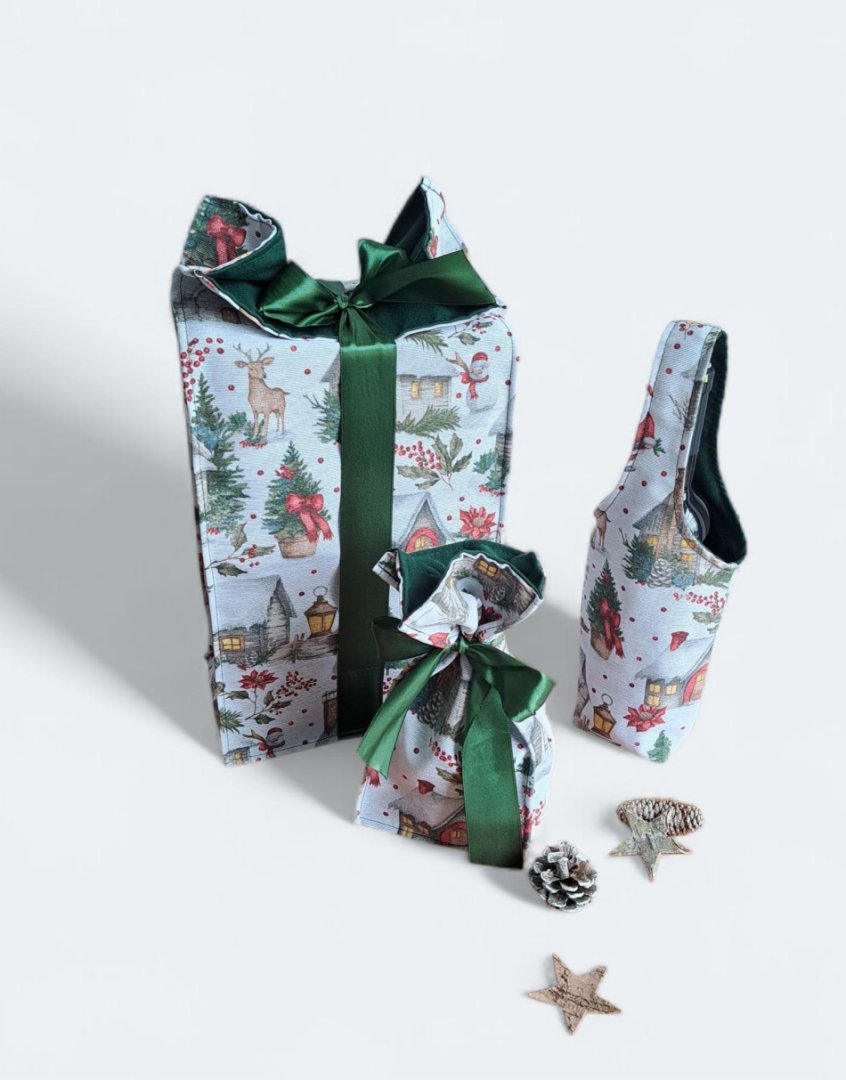 Povzneste darování vánočního dárku na novou úroveň! Tato dárková sada kombinuje luxusní vzhled s praktičností a udržitelností.Povzneste darování vánočního dárku na novou úroveň! Tato dárková sada kombinuje luxusní vzhled s praktičností a udržitelností. Sada kombinuje elegantní dárkovou tašku na lahev (víno, sekt, "bohemka"), velký pytlík na větší dárek a malý pytlík na drobnosti (šperky, kosmetiku, sladkosti) s okouzlujícím zimním a vánočním motivem – zasněžené chaloupky, jehličí a červené bobule. Vnitřní strana je podšitá elegantní tmavě zelenou látkou, která ladí se sváteční atmosférou. Připravte se na kouzelné Vánoce a dodejte svému dárku punc luxusu a originality. Zapomeňte na jednorázové papírové obaly. Dárková sada s vánočními motivy je navržena pro opakované použití. Všechny kusy jsou dostatečně pevné, chrání obsah a díky možnosti praní jsou skvělou alternativou k jednorázovým balicím papírům. Nabízí více způsobů zavázání, takže můžete experimentovat s mašlemi a uzly.