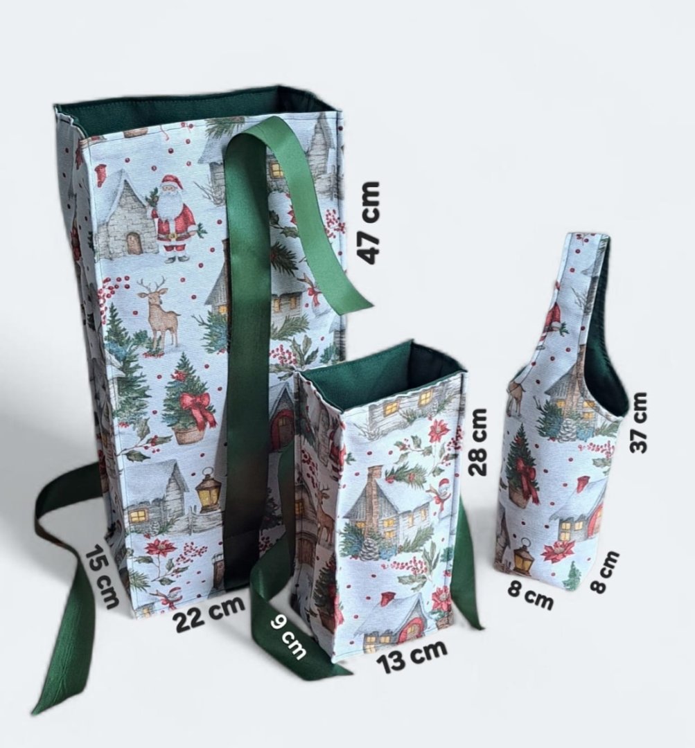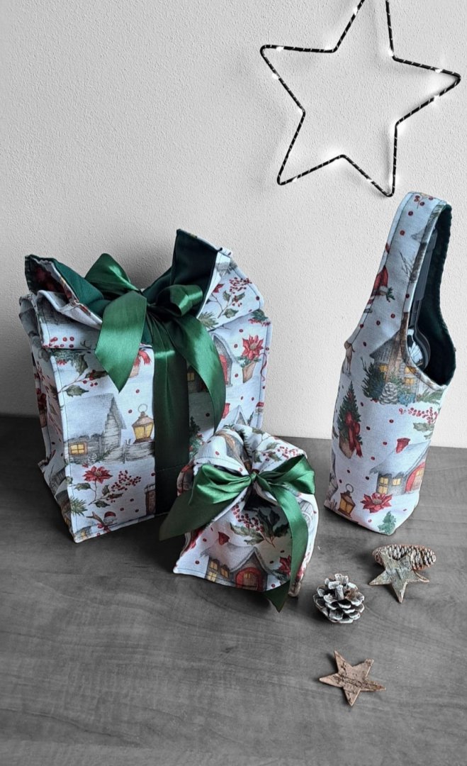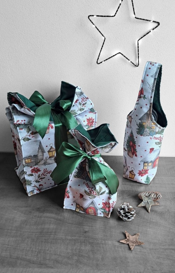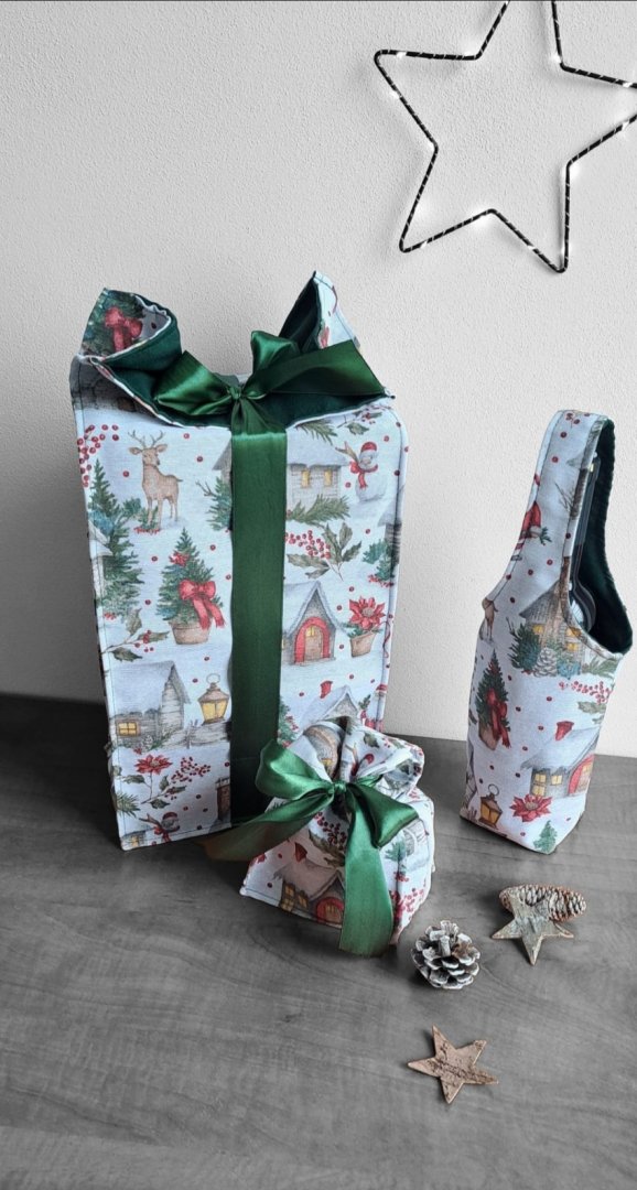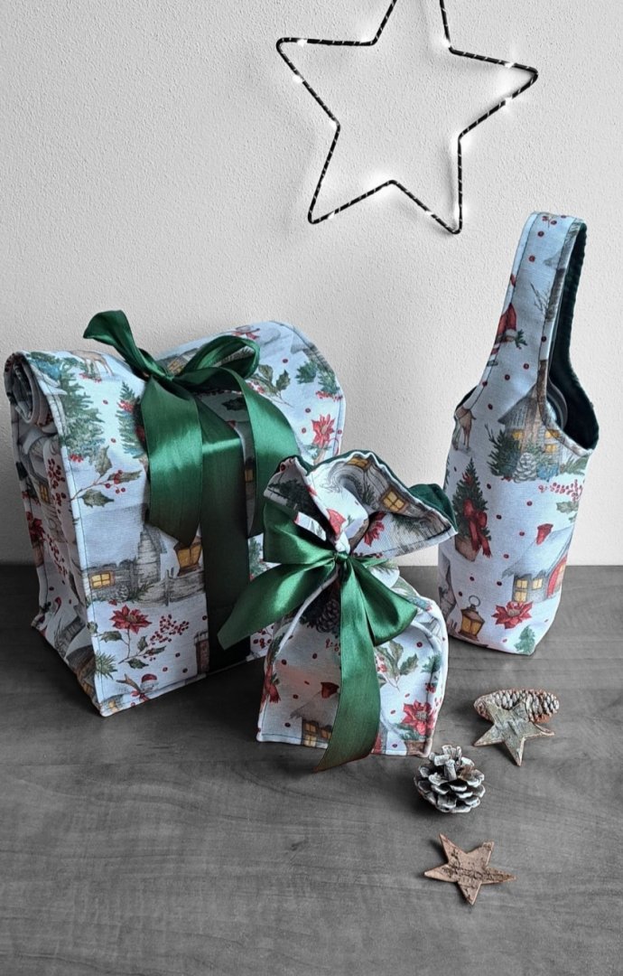 Povzneste darování vánočního dárku na novou úroveň! Tato dárková sada kombinuje luxusní vzhled s praktičností a udržitelností.Povzneste darování vánočního dárku na novou úroveň! Tato dárková sada kombinuje luxusní vzhled s praktičností a udržitelností. Sada kombinuje elegantní dárkovou tašku na lahev (víno, sekt, "bohemka"), velký pytlík na větší dárek a malý pytlík na drobnosti (šperky, kosmetiku, sladkosti) s okouzlujícím zimním a vánočním motivem – zasněžené chaloupky, jehličí a červené bobule. Vnitřní strana je podšitá elegantní tmavě zelenou látkou, která ladí se sváteční atmosférou. Připravte se na kouzelné Vánoce a dodejte svému dárku punc luxusu a originality. Zapomeňte na jednorázové papírové obaly. Dárková sada s vánočními motivy je navržena pro opakované použití. Všechny kusy jsou dostatečně pevné, chrání obsah a díky možnosti praní jsou skvělou alternativou k jednorázovým balicím papírům. Nabízí více způsobů zavázání, takže můžete experimentovat s mašlemi a uzly.