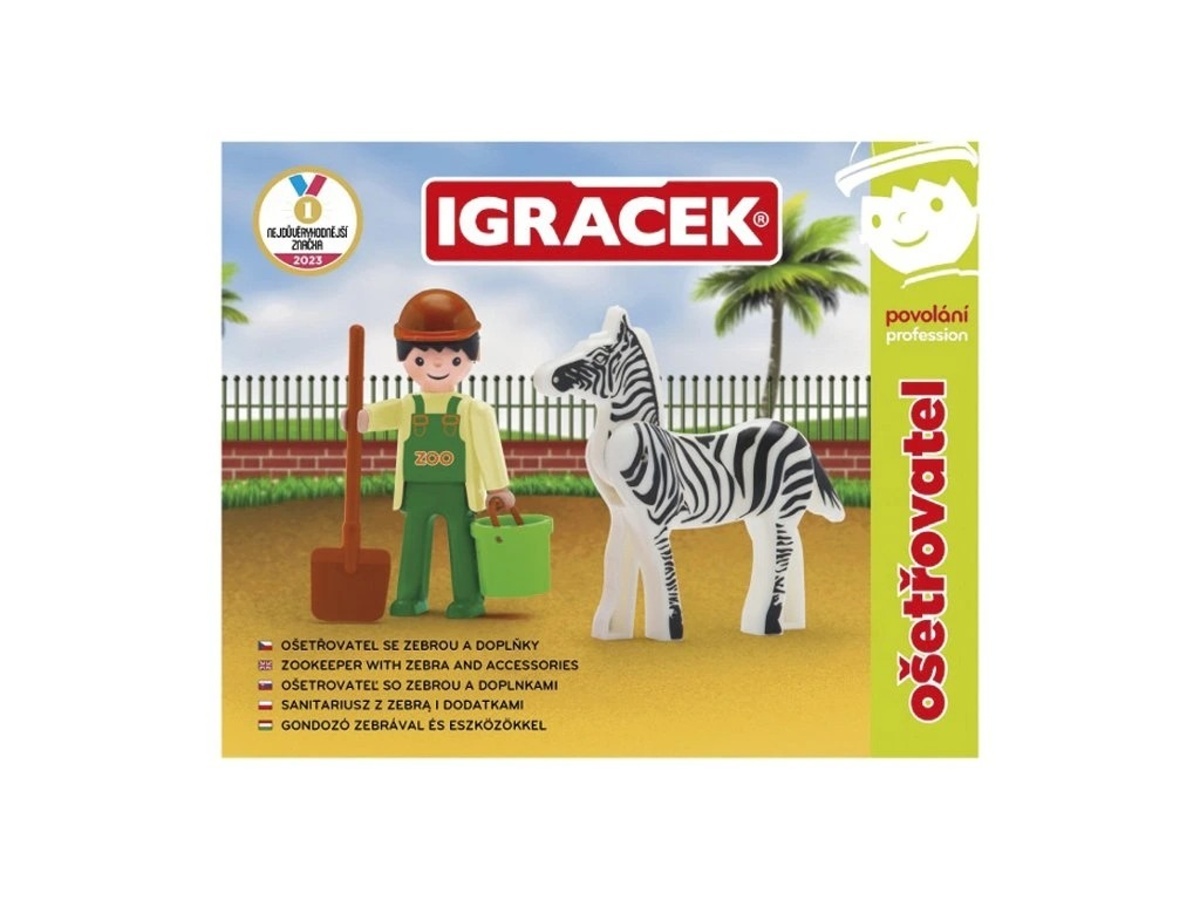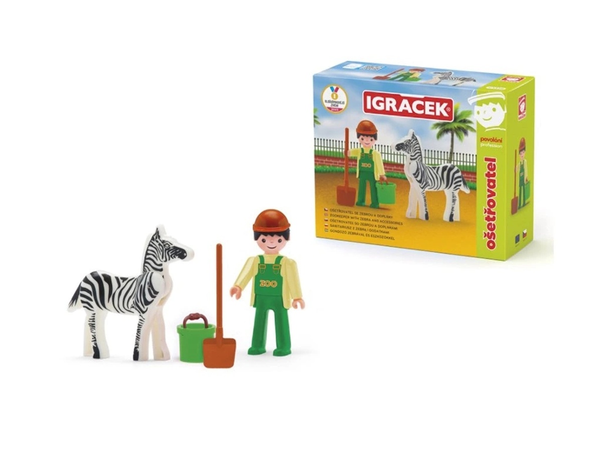 Ošetřovatel s hráběmi, kbelíkem a lopatou vzorně pěčuje o krásnou zebru ve své zoo. Kdo má rád zvířata, má rád i lidi. Hračka rozvíjí jemnou motoriku a fantazii dětí.