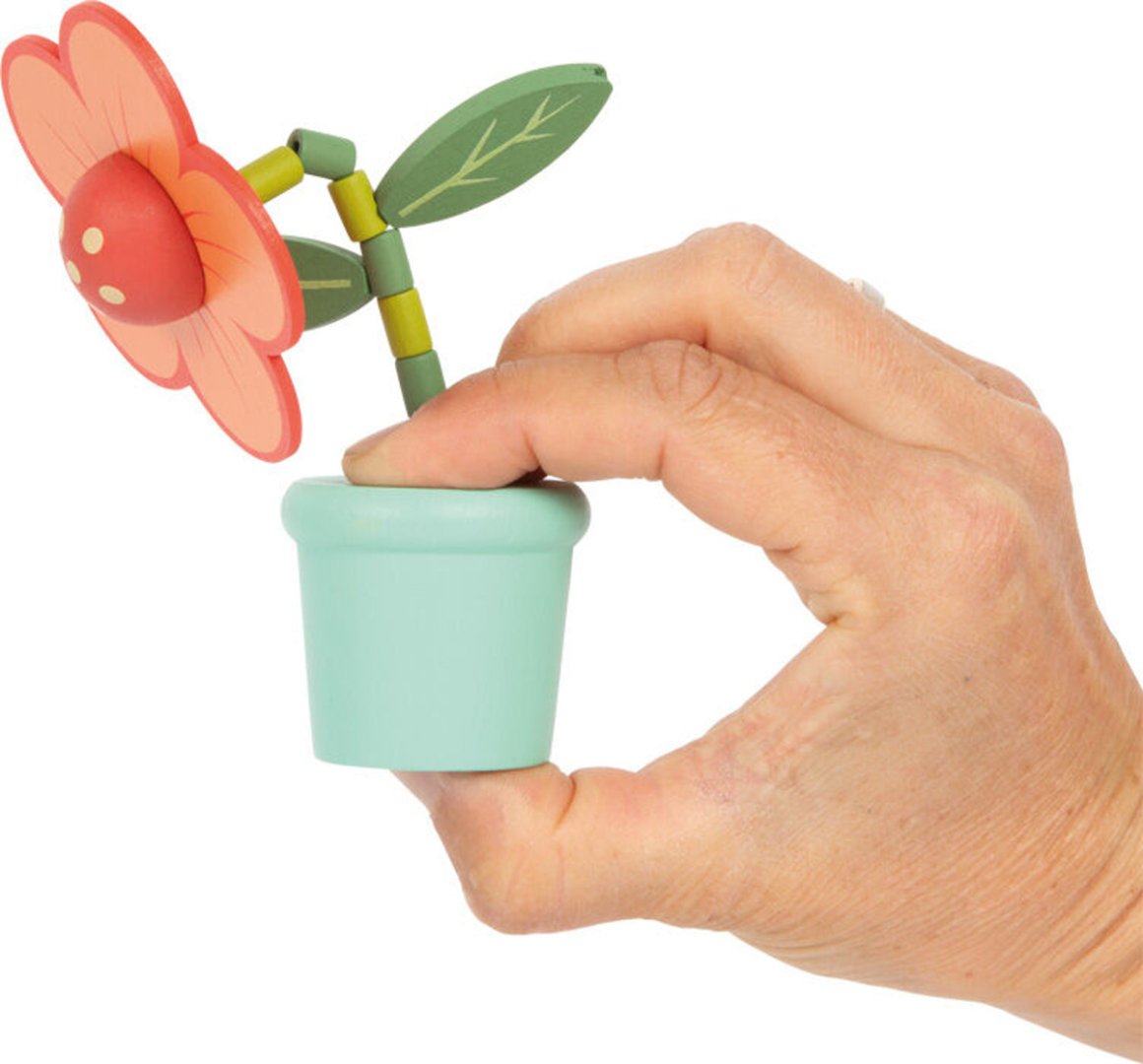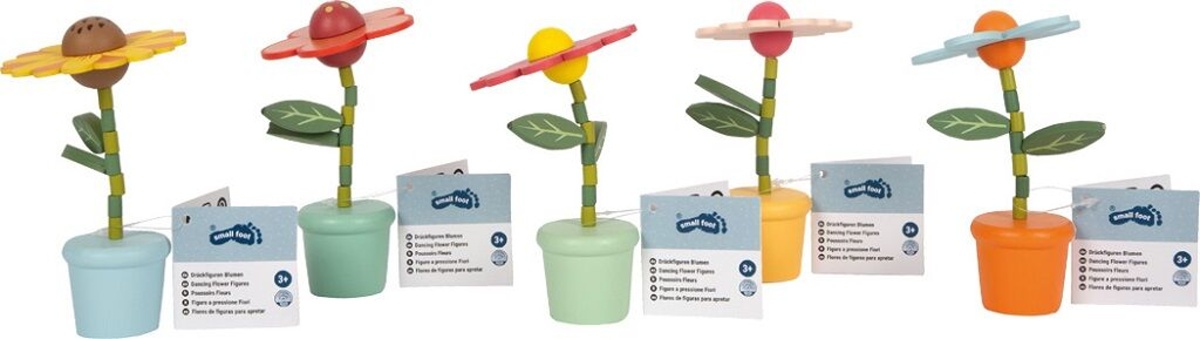 Tančící dřevěná figurka s květinovým vzorem. Každá z těchto pečlivě navržených dřevěných figurek ožívá svým vlastním způsobem, jakmile stisknete spodní část květináče.Tančící dřevěná figurka s květinovým vzorem. Každá z těchto pečlivě navržených dřevěných figurek ožívá svým vlastním způsobem, jakmile stisknete spodní část květináče. Květiny se jemně kolébají, stonky se zavrtí a každý pohyb je jiný – záleží na tom, jak silně a kam zatlačíte. Tento jednoduchý, ale fascinující princip hry rozvíjí jemnou motoriku, koordinaci i vnímání pohybu. Figurka vyvolává překvapení, radost i smích a díky tomu, že žádný pohyb není stejný, děti (ale i dospělí) neodolají opakovanému zkoušení. Díky jasným barvám, hladkému povrchu a menší velikosti je skvělá pro malé dětské ručičky.