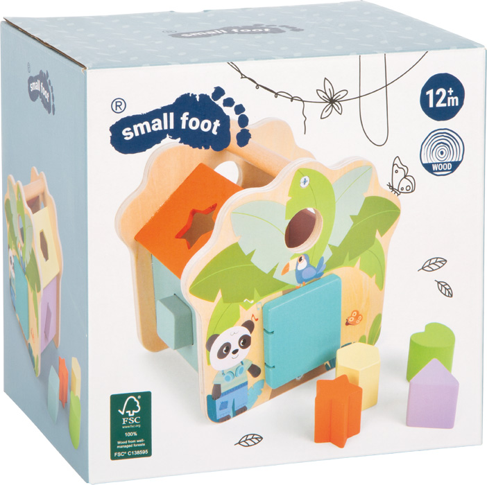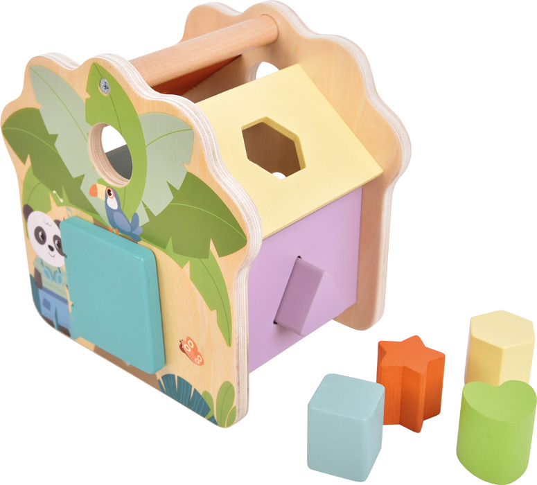 Třídění, vkládání a učení ještě nikdy nebylo tak zábavné!Třídění, vkládání a učení ještě nikdy nebylo tak zábavné! Tento s láskou navržený domeček z certifikovaného FSC® 100% dřeva přináší dětem hravý způsob, jak objevovat svět tvarů a barev. Barevné dřevěné kostky v pěti různých tvarech se vkládají do odpovídajících otvorů po stranách domečku a procvičují tak logické myšlení, jemnou motoriku a koordinaci ruka-oko.