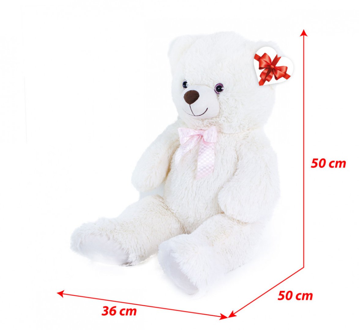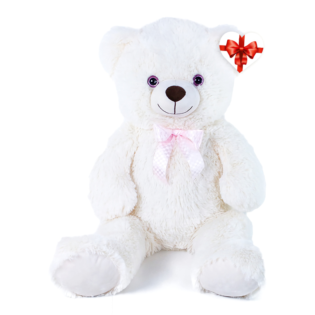 Plyšový medvěd nesmí chybět v žádném dětském pokojíčku!Plyšový medvěd nesmí chybět v žádném dětském pokojíčku! Medvěd ve velikosti 78 cm je vyroben z kvalitní heboučké plyše, má krémově bílou barvu a krk mu zdobí růžová saténová mašle. Tento plyšový kousek je ideálním dárkem pro malé i velké! Součástí je papírová visačka ve tvaru srdíčka, na kterou můžete napsat věnování.