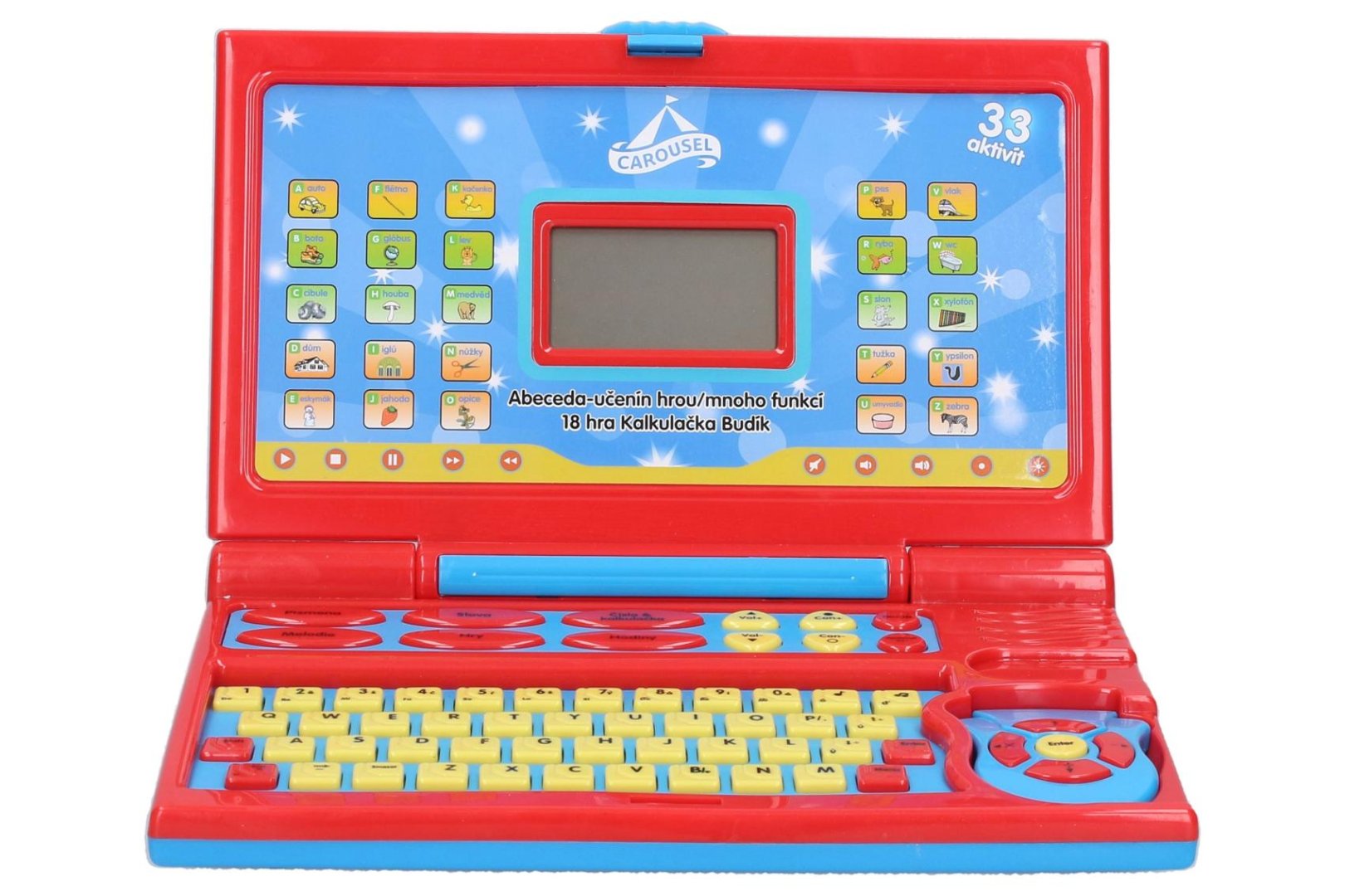 Výuka abecedy, slov, čísel, melodie, hry, hodiny, opakovací funkce, nastavení hlasitosti, podsvícení displeje.