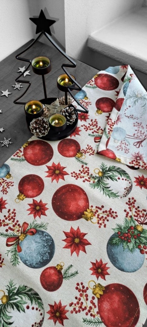 Vytvořte si dokonalou sváteční atmosféru! Tento elegantní běhoun na stůl je ideálním doplňkem pro Vaše vánoční stolování.Vytvořte si dokonalou sváteční atmosféru! Tento elegantní běhoun na stůl je ideálním doplňkem pro Vaše vánoční stolování. Běhoun, na kterém vynikají velké červené vánoční koule, okamžitě vnese do interiéru útulnou a slavnostní atmosféru. Kombinace bavlny a polyesteru zajišťuje snadnou údržbu a dlouhou životnost.
