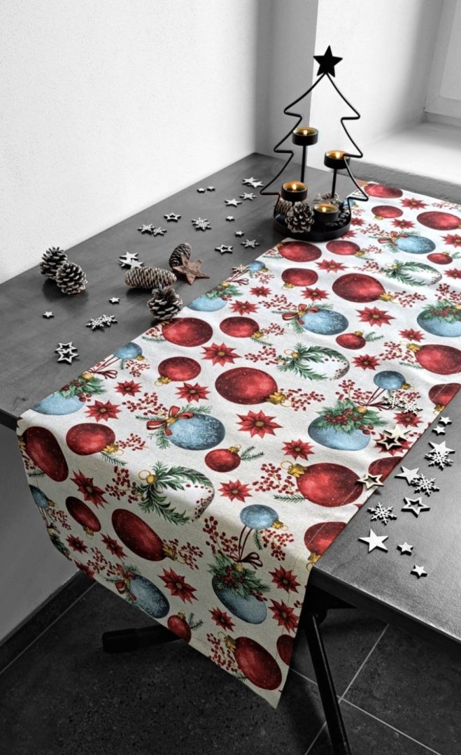 Vytvořte si dokonalou sváteční atmosféru! Tento elegantní běhoun na stůl je ideálním doplňkem pro Vaše vánoční stolování.Vytvořte si dokonalou sváteční atmosféru! Tento elegantní běhoun na stůl je ideálním doplňkem pro Vaše vánoční stolování. Běhoun, na kterém vynikají velké červené vánoční koule, okamžitě vnese do interiéru útulnou a slavnostní atmosféru. Kombinace bavlny a polyesteru zajišťuje snadnou údržbu a dlouhou životnost.