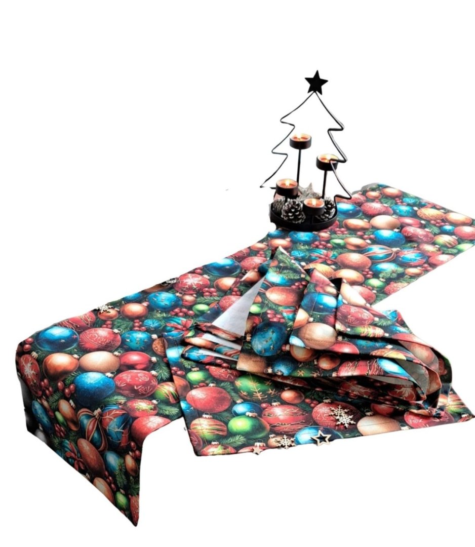 Vytvořte si dokonalou sváteční atmosféru! Tato vánoční sada s běhounem na stůl a prostíráním je ideálním doplňkem pro vaše vánoční stolování.Vytvořte si dokonalou sváteční atmosféru! Tato vánoční sada s běhounem na stůl a prostíráním je ideálním doplňkem pro vaše vánoční stolování. Běhoun i prostírání s motivem zářivých vánočních ozdob okamžitě okamžitě vnesou do interiéru útulnou a slavnostní atmosféru. Kombinace bavlny a polyesteru zajišťuje snadnou údržbu a dlouhou životnost.