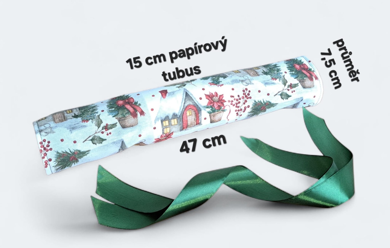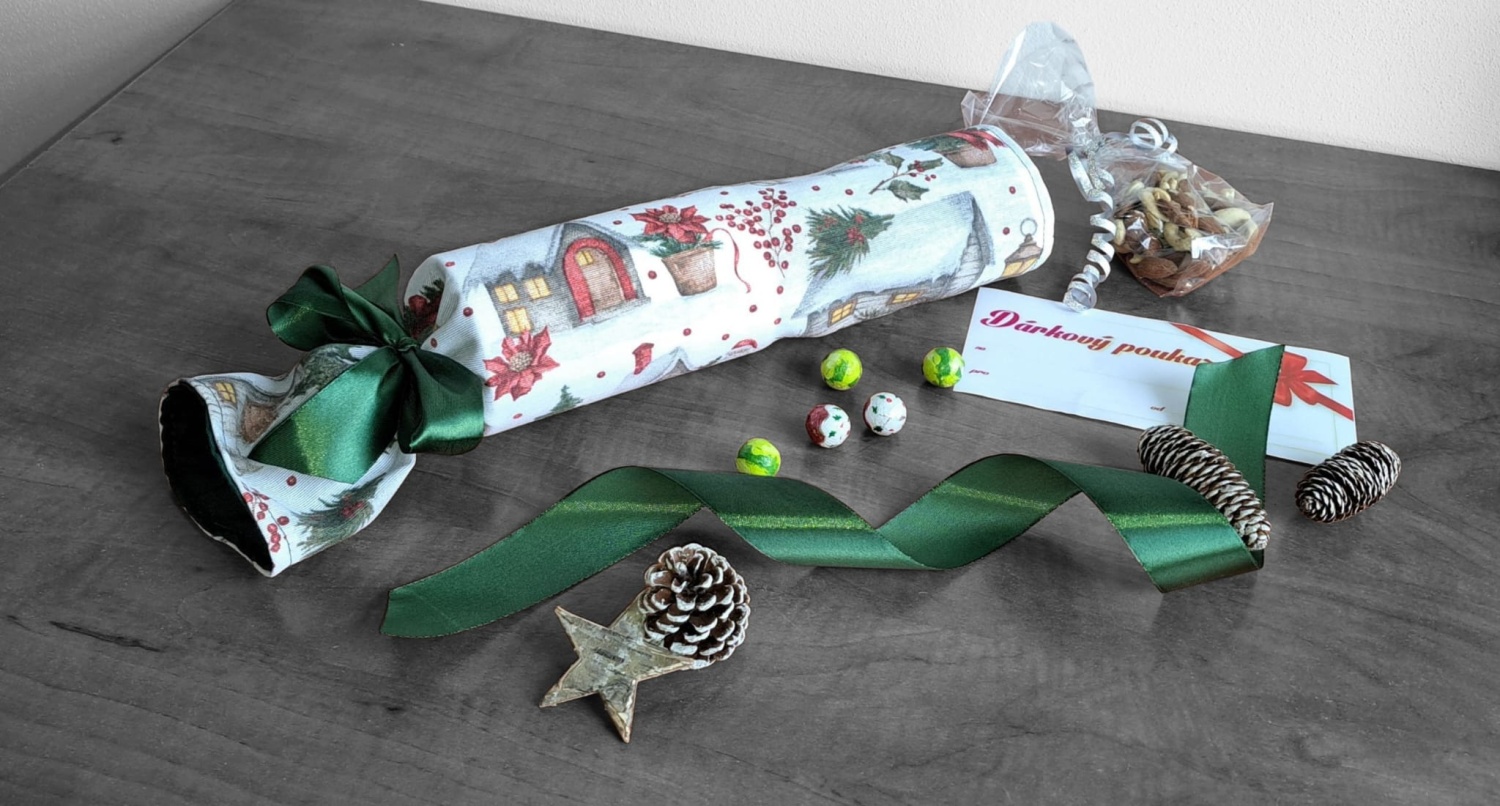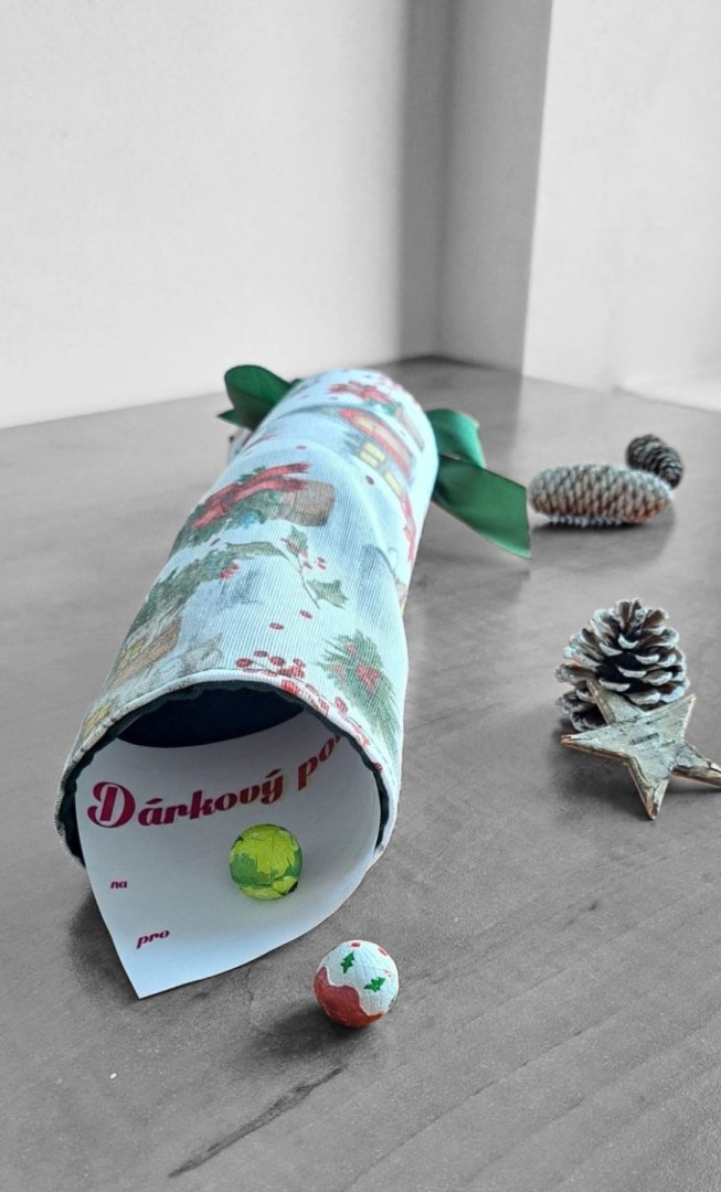Hledáte originální a ekologický způsob pro balení vánočních dárků, poukazů nebo peněz? Tento opakovaně použitelný textilní bonbón je ideální řešení!Hledáte originální a ekologický způsob pro balení vánočních dárků, poukazů nebo peněz? Tento opakovaně použitelný textilní bonbón je ideální řešení! Jeho pevný vnitřní tubus dokonale chrání obsah – ať už se jedná o dárkové poukazy, obálky s penězi nebo třeba o čokoládové bonbóny, oříšky, malé hračky nebo kosmetiku. Látku s okouzlujícím zimním a vánočním motivem zdobí zasněžené chaloupky, jehličí a červené bobule. Stačí jen stáhnout stuhou a vytvoříte dokonalý "bonbón"! Připravte se na kouzelné Vánoce a dodejte svému dárku punc luxusu a originality.