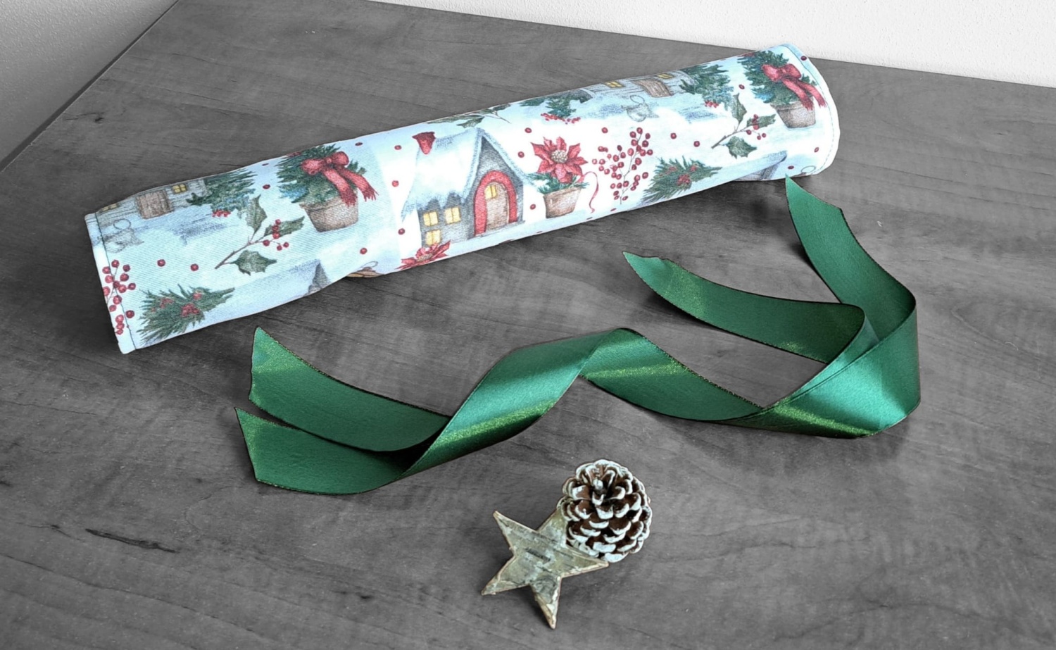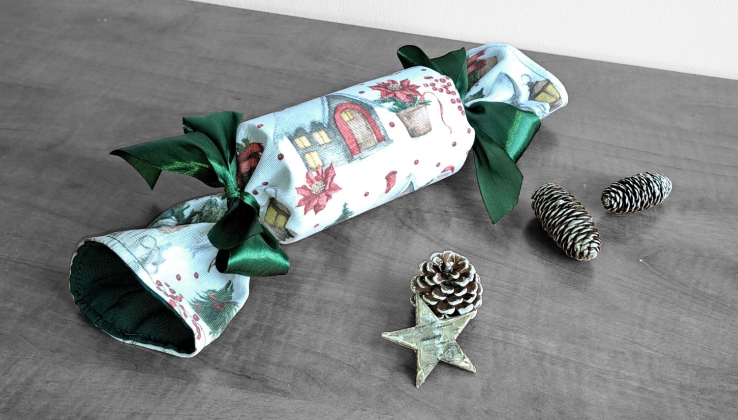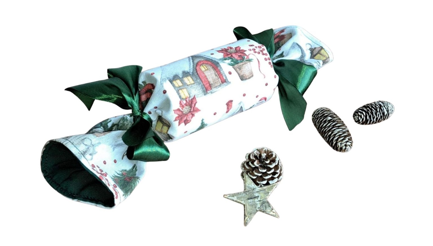 Hledáte originální a ekologický způsob pro balení vánočních dárků, poukazů nebo peněz? Tento opakovaně použitelný textilní bonbón je ideální řešení!Hledáte originální a ekologický způsob pro balení vánočních dárků, poukazů nebo peněz? Tento opakovaně použitelný textilní bonbón je ideální řešení! Jeho pevný vnitřní tubus dokonale chrání obsah – ať už se jedná o dárkové poukazy, obálky s penězi nebo třeba o čokoládové bonbóny, oříšky, malé hračky nebo kosmetiku. Látku s okouzlujícím zimním a vánočním motivem zdobí zasněžené chaloupky, jehličí a červené bobule. Stačí jen stáhnout stuhou a vytvoříte dokonalý "bonbón"! Připravte se na kouzelné Vánoce a dodejte svému dárku punc luxusu a originality.