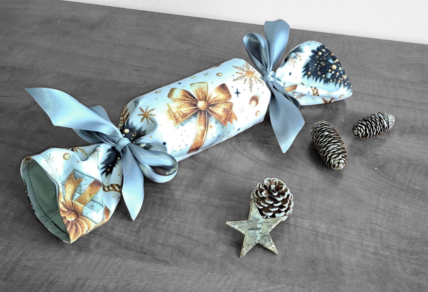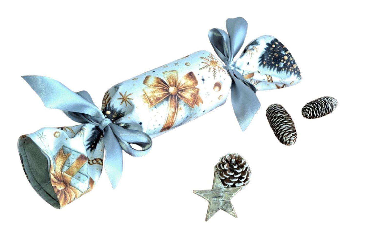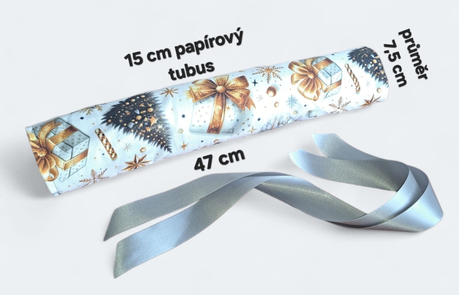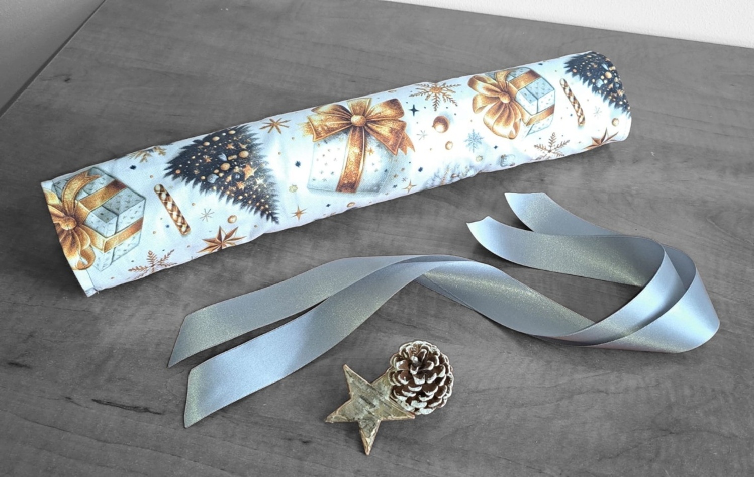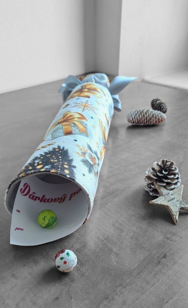 Hledáte originální a ekologický způsob pro balení vánočních dárků, poukazů nebo peněz? Tento opakovaně použitelný textilní bonbón je ideální řešení! Jeho pevný vnitřní tubus dokonale chrání obsah – ať už se jedná o dárkové poukazy, obálky s penězi nebo třeba o čokoládové bonbóny, oříšky, malé hračky nebo kosmetiku. Látku se zlatým vánočním motivem zdobí mašle, jmelí a stromeček. Stačí jen stáhnout stuhou a vytvoříte dokonalý "bonbón"! Připravte se na kouzelné Vánoce a dodejte svému dárku punc luxusu a originality.