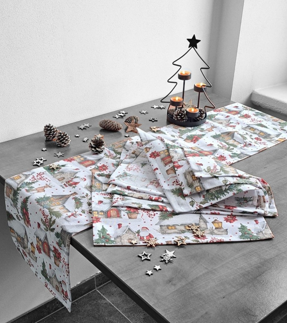 Vytvořte si dokonalou sváteční atmosféru! Tato vánoční sada s běhounem na stůl a prostíráním je ideálním doplňkem pro vaše vánoční stolování.Vytvořte si dokonalou sváteční atmosféru! Tato vánoční sada s běhounem na stůl a prostíráním je ideálním doplňkem pro vaše vánoční stolování. Běhoun i prostírání s okouzlujícím zimním a vánočním motivem – zasněžené chaloupky, jehličí a červené bobule – okamžitě vnesou do interiéru útulnou a slavnostní atmosféru. Kombinace bavlny a polyesteru zajišťuje snadnou údržbu a dlouhou životnost.