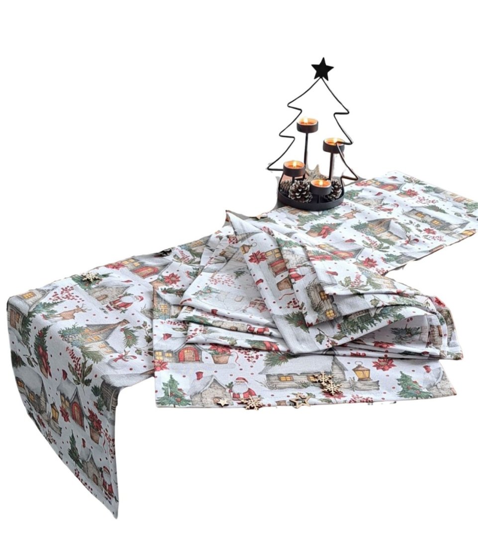Vytvořte si dokonalou sváteční atmosféru! Tato vánoční sada s běhounem na stůl a prostíráním je ideálním doplňkem pro vaše vánoční stolování.Vytvořte si dokonalou sváteční atmosféru! Tato vánoční sada s běhounem na stůl a prostíráním je ideálním doplňkem pro vaše vánoční stolování. Běhoun i prostírání s okouzlujícím zimním a vánočním motivem – zasněžené chaloupky, jehličí a červené bobule – okamžitě vnesou do interiéru útulnou a slavnostní atmosféru. Kombinace bavlny a polyesteru zajišťuje snadnou údržbu a dlouhou životnost.