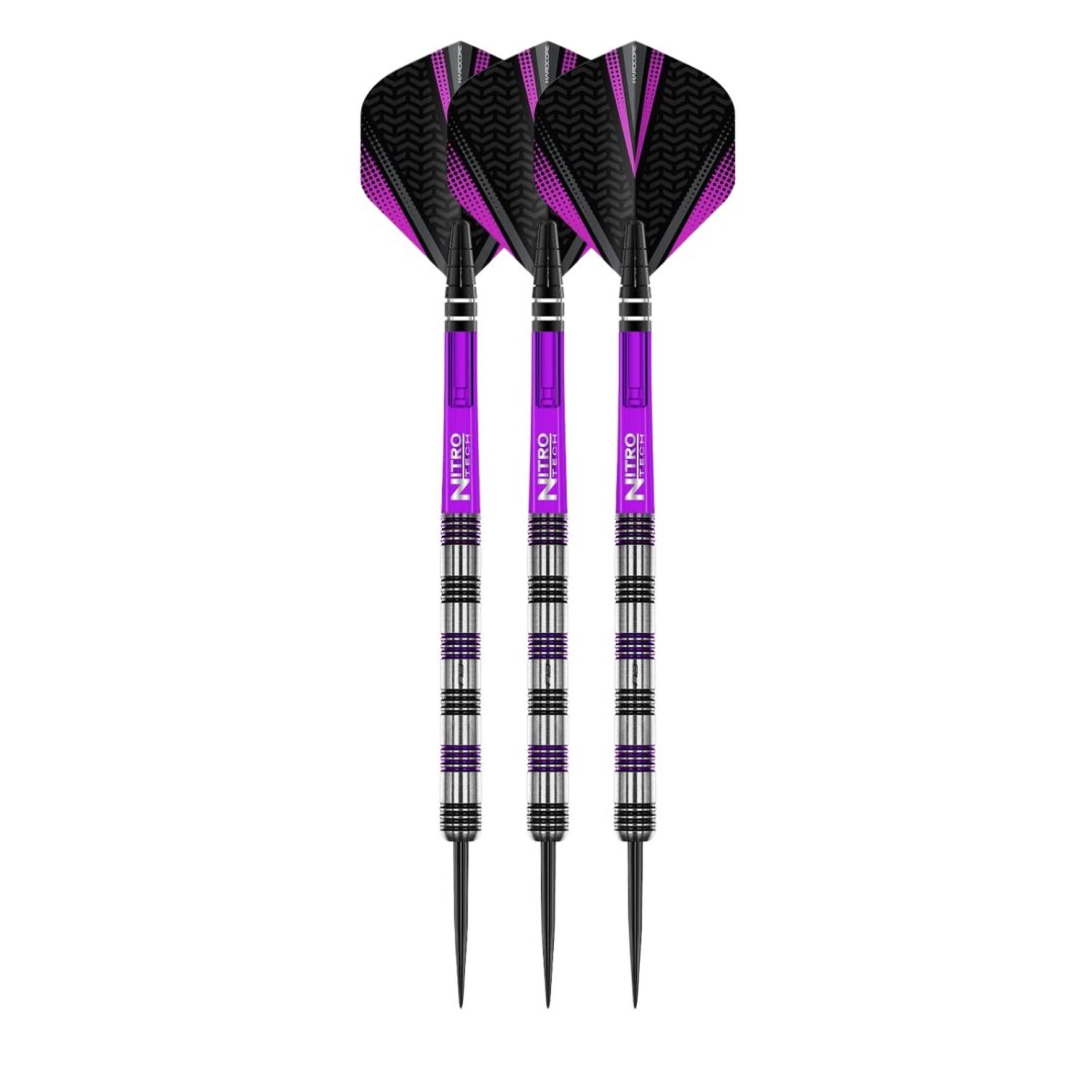 Steelové šipky Red Dragon Gemma Hayter jsou wolframové šipky (90% tungsten) s barrely, které mají černé a fialové proužky. Barrely jsou doplněny nylonovými násadkami Nitrotech a letkami Hardcore.
